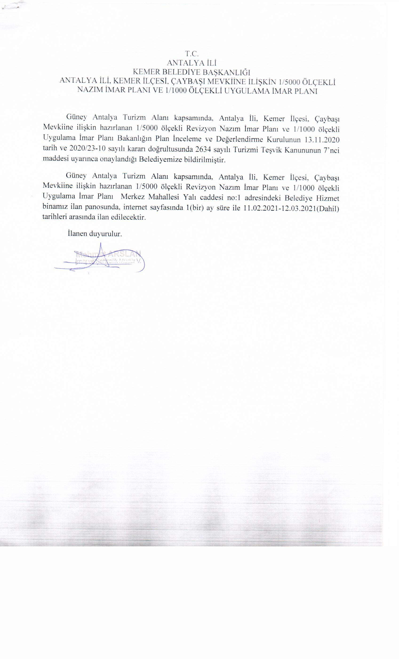 Kemer İlçesi, Çaybaşı Mevkii 1/5000 ölçekli Nip ve 1/1000 Ölçekli UİP onayı