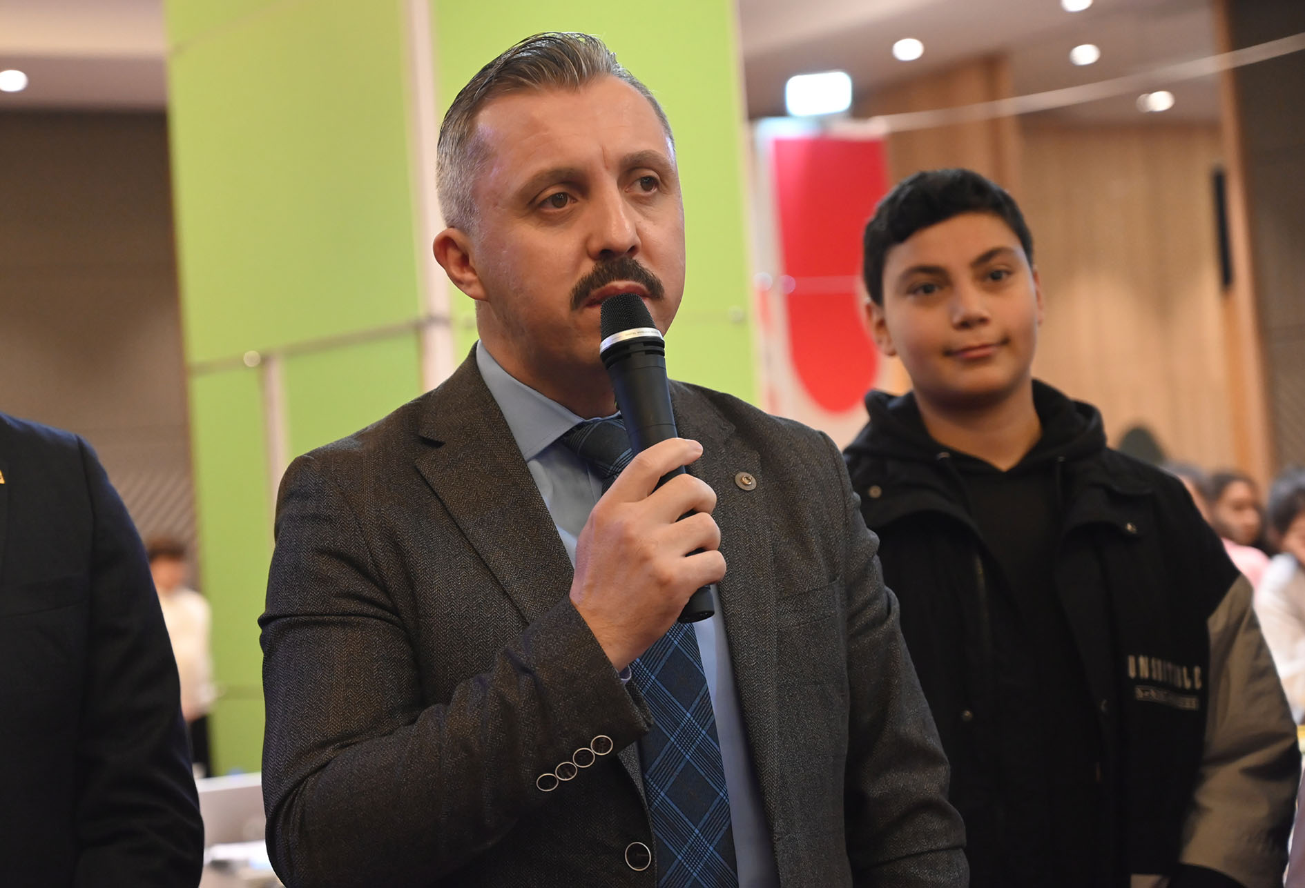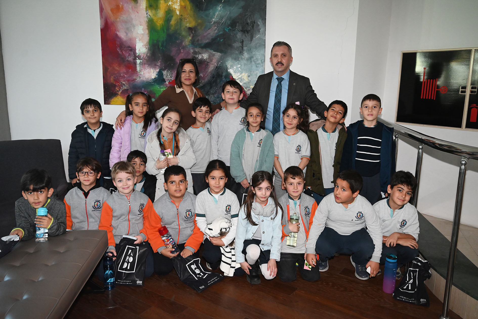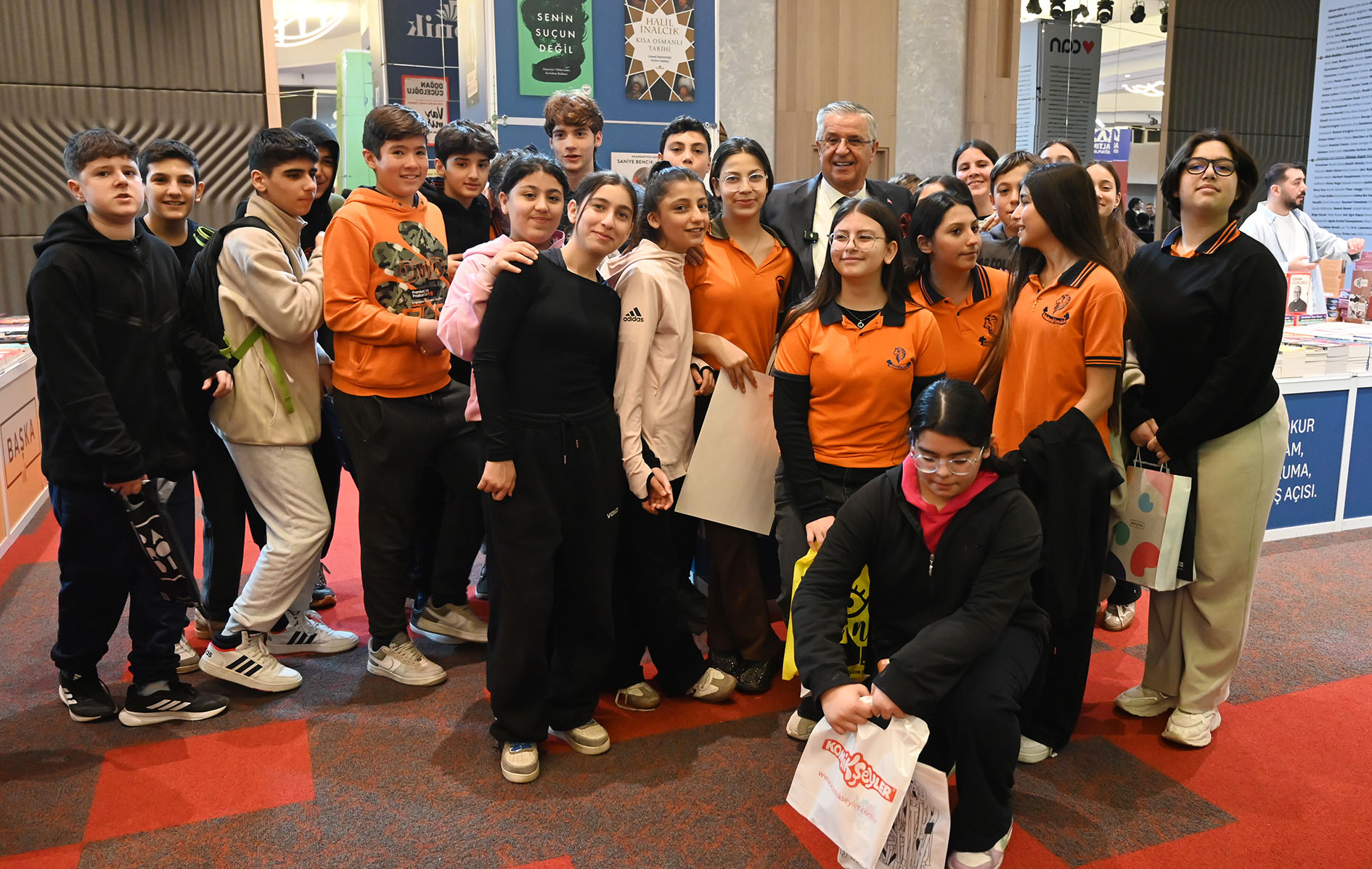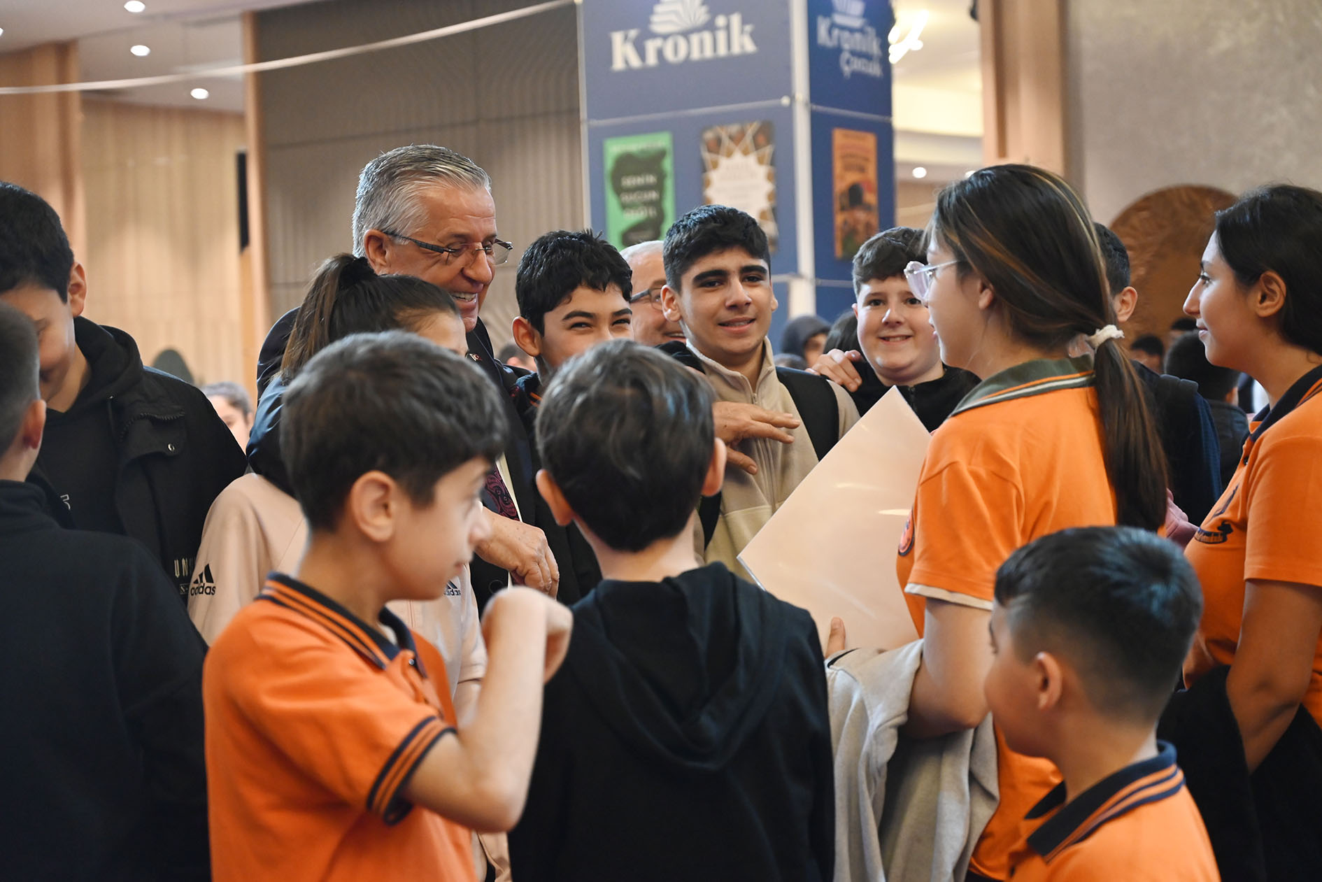Fuar alanına belediye araçlarıyla taşınan öğrenciler Başkan Topaloğlu ile selamlaşarak sohbet edip hatıra fotoğrafı çektirdi.