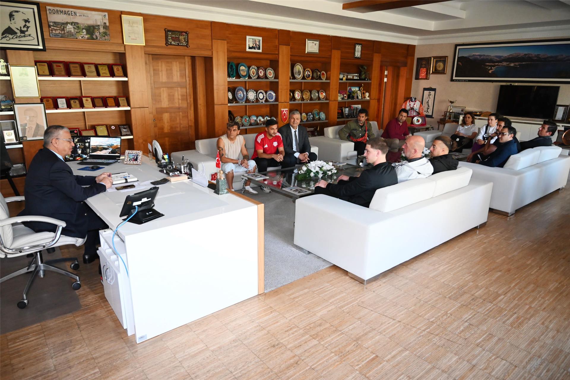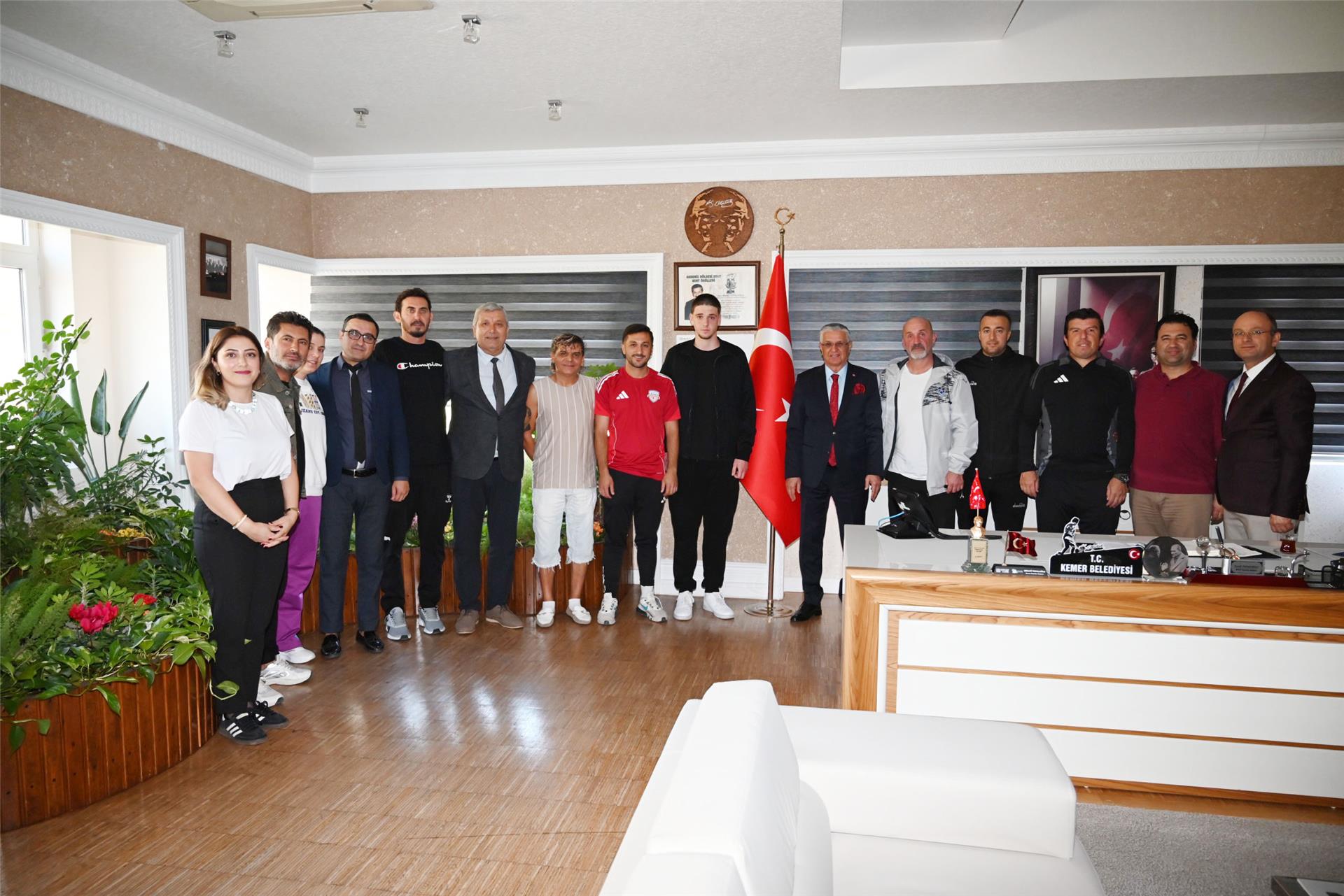 Kemer Belediyesi Merkez Spor Kulübü Başkanı Ayhan Süel, Teknik Direktörler Melih Bildiş, İskender Gökcan ve Tayfun Yaz, kaleci antrenörü Erkan Polat, Kemer Belediyesi Voleybol Antrenörü Vedat Demirel, Sultan Ünal, Basketbol Antrenörü Nilüfer Bağcı, Kemer Belediye Başkanı Necati Topaloğlu'nu makamında ziyaret etti.