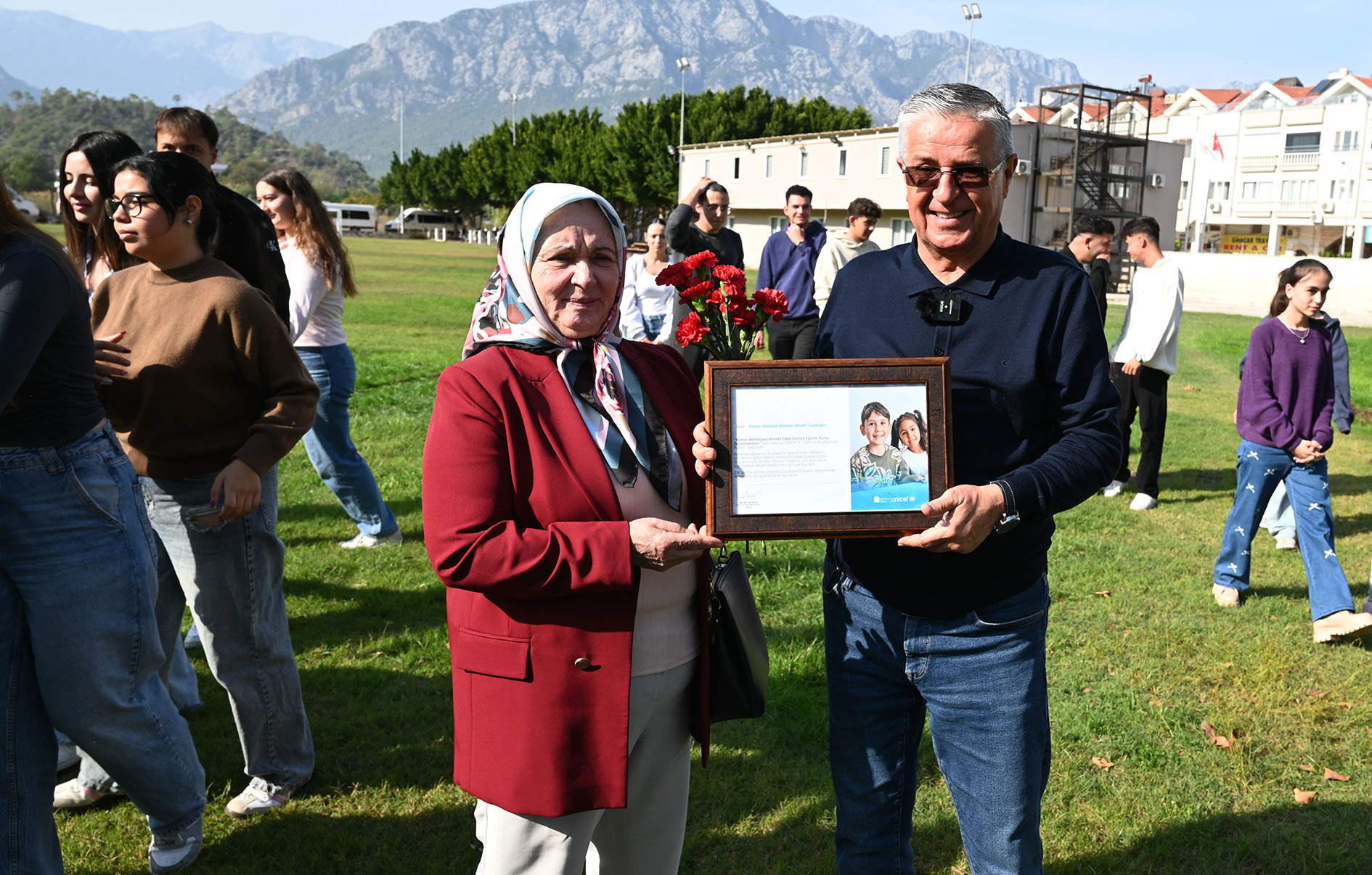 Suat Göv daha sonra çiçekler yerine Başkan Topaloğlu adına UNICEF'e yaptıkları bağışın belgesini Başkan Topaloğlu'na takdim etti.