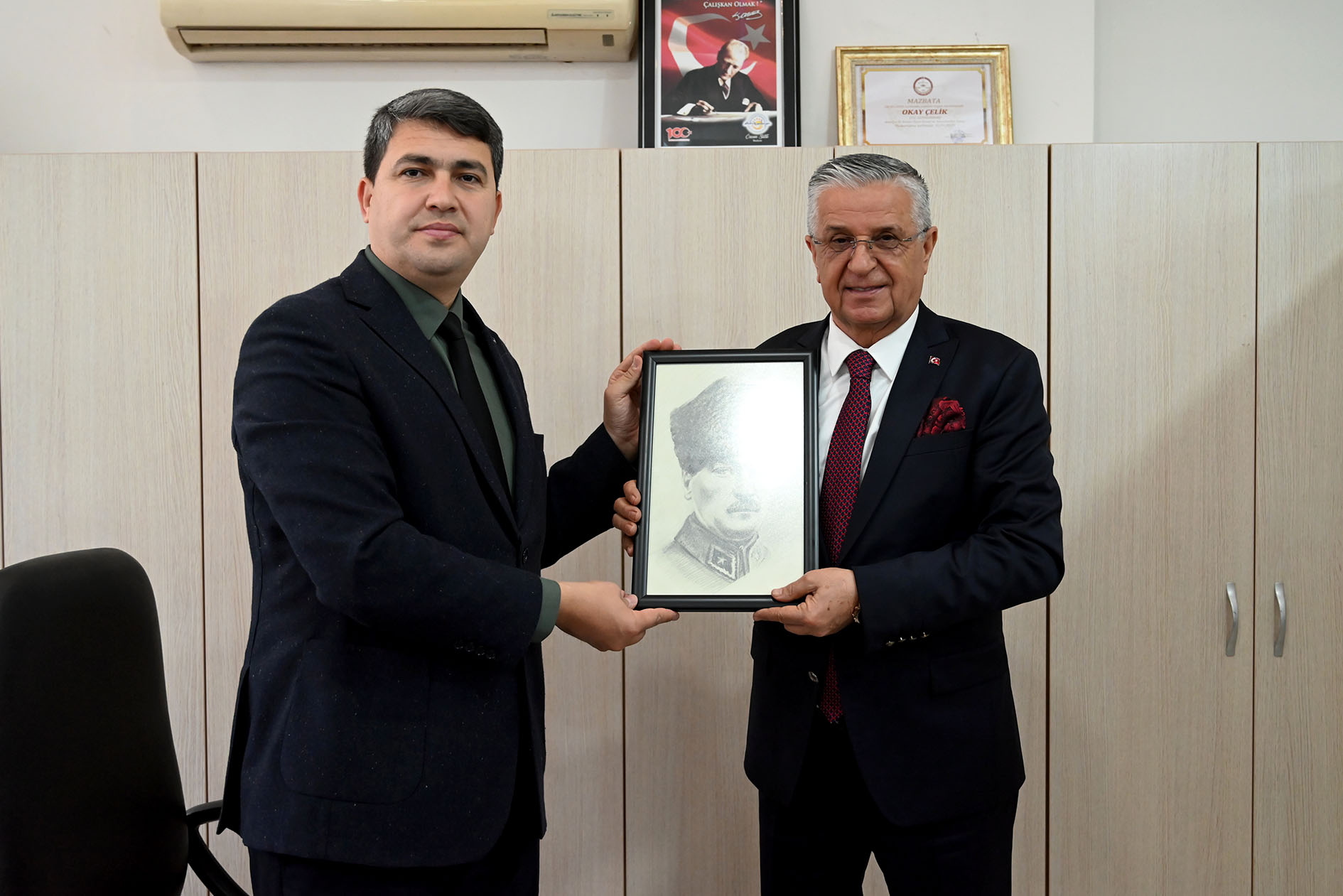 Ziyaret sonrası Başkan Topaloğlu, Okay Çelik'e Atatürk tablosu hediye ederek hatıra fotoğrafı çektirdi.