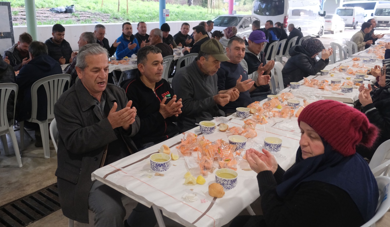 Zabıta ekiplerinin kurduğu masalara davet edilen pazar esnafı, soğuk havada sıcak çorbalarını içti.