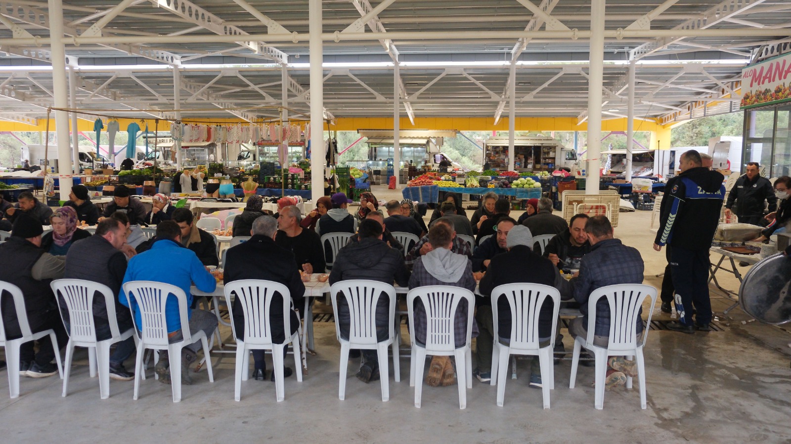 Başkan Topaloğlu'nun “Her mahalleye bir kapalı pazar yeri” projesi kapsamında yapılan Tekirova kapalı pazar yerinde düzenlenen çorba ikramına Başkan Topaloğlu'nun yanı sıra Kemer Belediye Başkan Yardımcısı Semih Top, Kemer Belediye Meclis Üyesi Mustafa Çelik, Kemer Belediyesi Tekirova Mahalle Sorumlusu Recep Yılmaz, Kemer Belediyesi Zabıta Müdürü Erhan Kurtoğlu ve pazar esnafı katıldı.