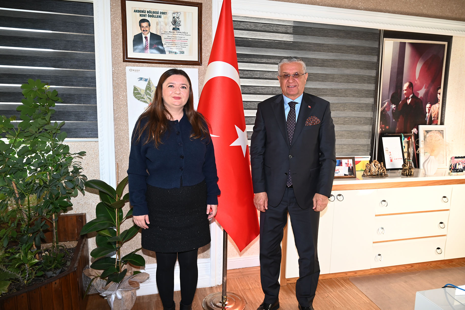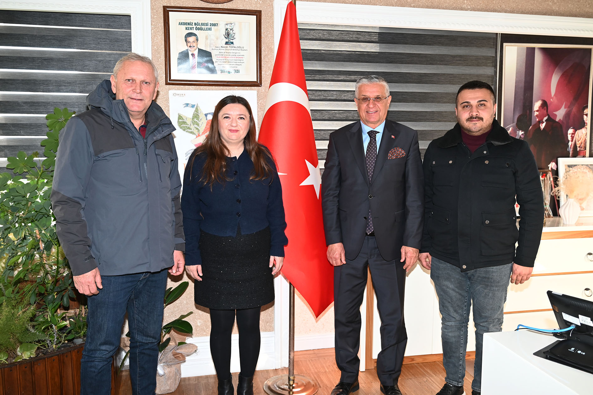 Afyon Evciler Belediye Başkanı Berrin Uğurlu ve Fen İşleri Teknikeri Ahmet Can Özer, Kemer Belediye Başkanı Necati Topaloğlu'na makamında nezaket ziyaretinde bulundu. Ziyarette, Kemer Belediye Başkan Yardımcısı Emin Gül de yer aldı.
