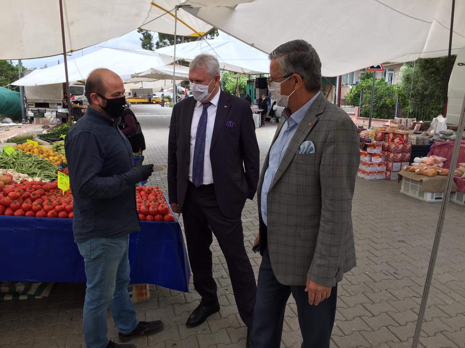 Pazar girişlerinde ateşini ölçtüren ve ellerini dezenfekte eden Başkanımız Topaloğlu'na Belediye Başkan Yardımcımız Emin Gül de eşlik etti.