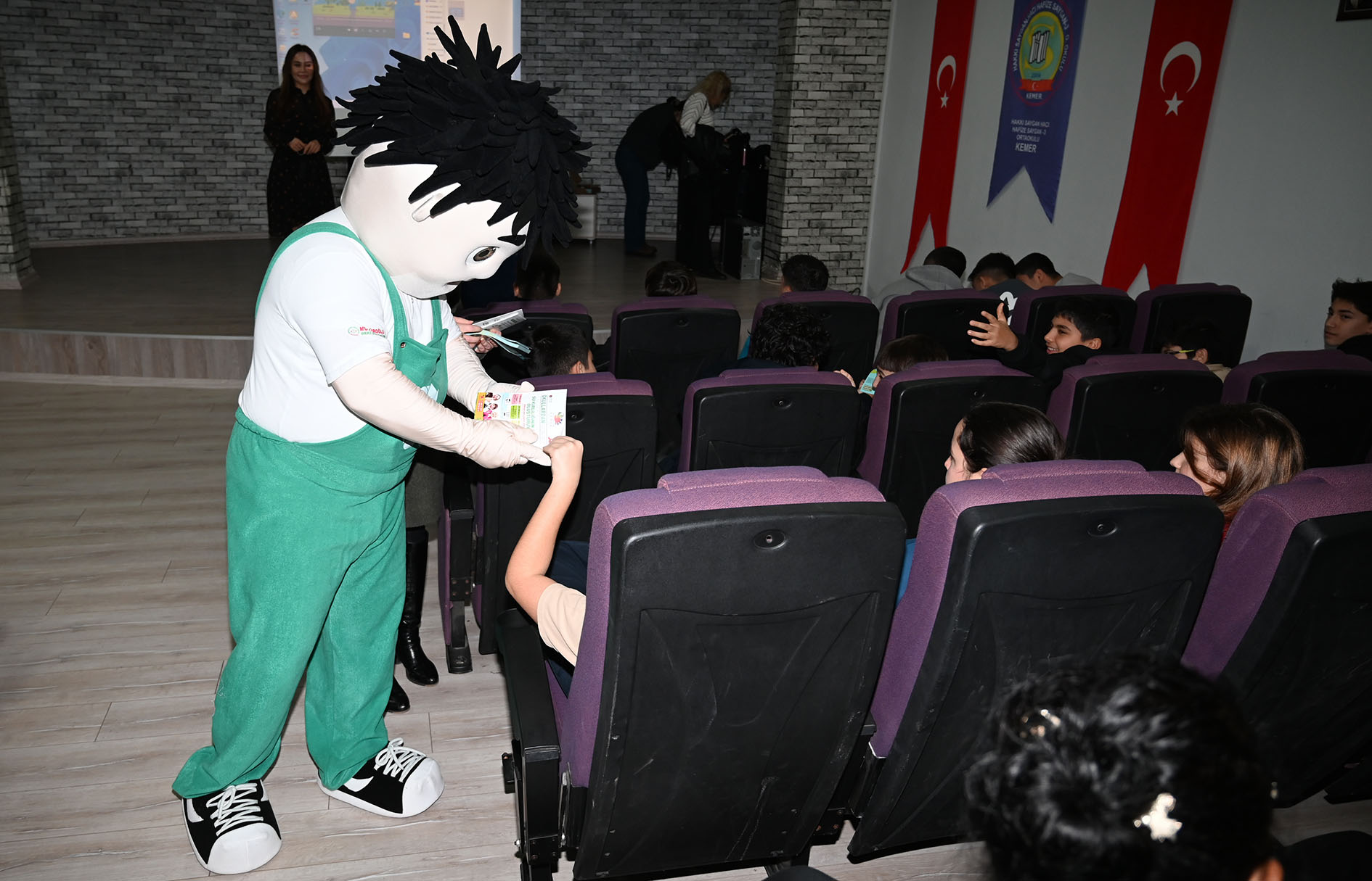 Karşılarında çevre dedektifi Kerem'i gören öğrenciler hem şaşırdı hem de anlatılan bilgileri dikkatle dinledi. Maskot Kerem'le fotoğraf da çektiren öğrenciler keyifli zaman geçirdi.