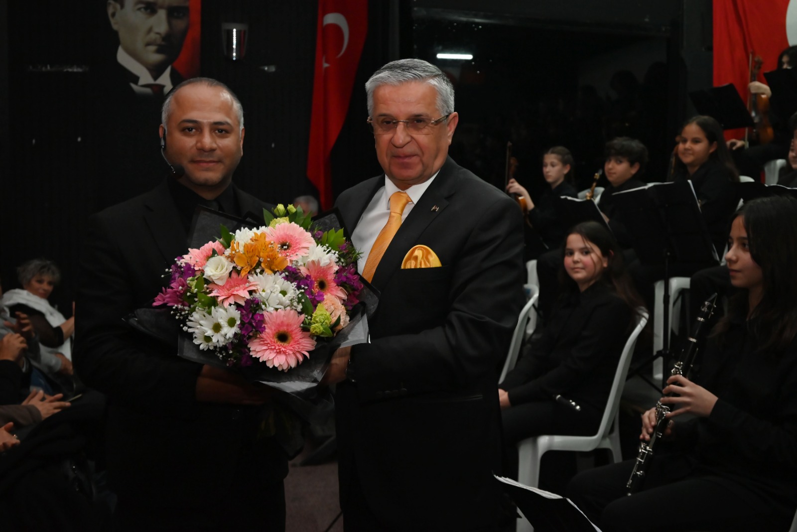 Başkan Topaloğlu, konser sonrası Şef Furkan Üstündağ'a, eşi Fikriye Topaloğlu solist Füsun Sovuksu'ya, meclis üyesi İsmail Aka solist Seyit Mehmet Sakin'e, meclis üyesi Mustafa Bilici Akdeniz Üniversitesi Güzel Sanatlar Fakültesi Bölüm Başkanı Prof. Dr. Cengiz Şengül'e çiçek verdi.