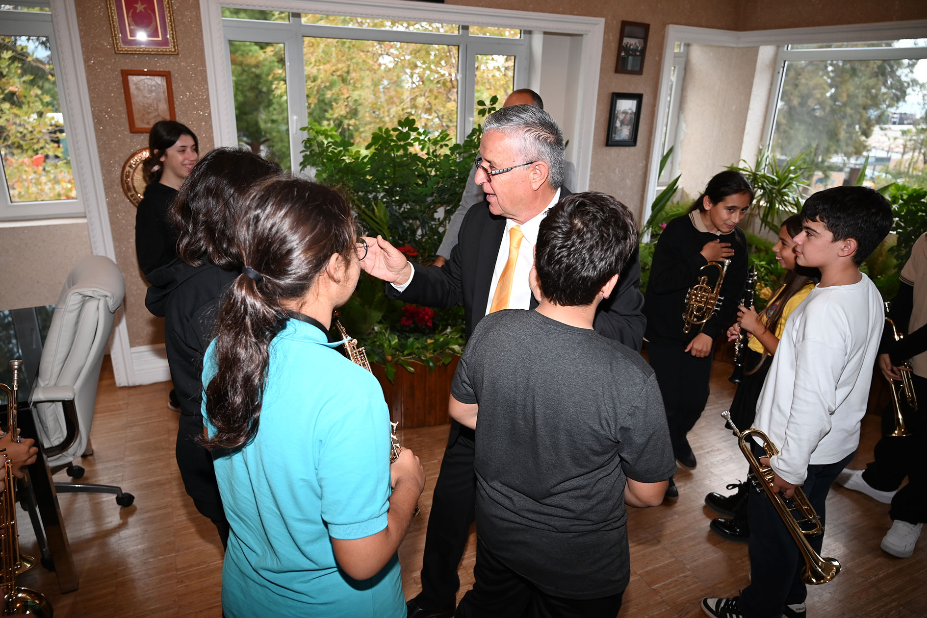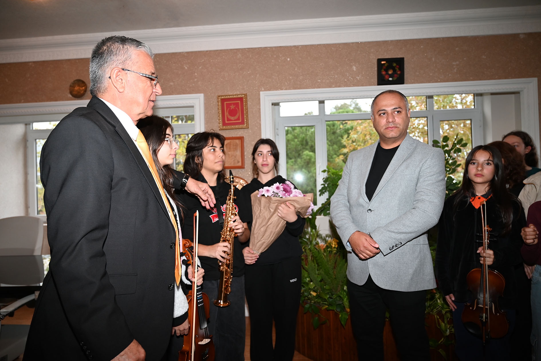 Geleceğin müzisyenlerini makam kapısında karşılayan Başkan Topaloğlu, öğrencilerin sürprizi karşısında duygu dolu anlar yaşadı.