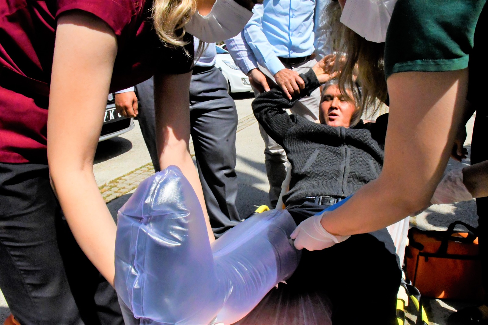 Senaryo gereği çay ocağında mahsur kalan bir personel olduğunun tespit edilmesinin ardından acil yardım ekibi binaya güvenli ve hızlı şekilde girerek, yaralanan personelin tahliyesini gerçekleştirdi.