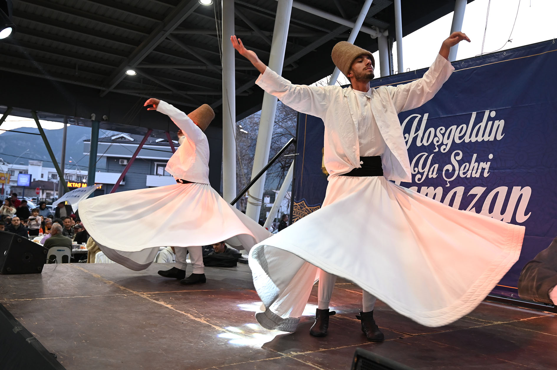 İftar yemeğine katılan vatandaşlar semazen gösterisini ilgiyle izlerken bazı vatandaşlar gösteriyi cep telefonları ile görüntüledi.