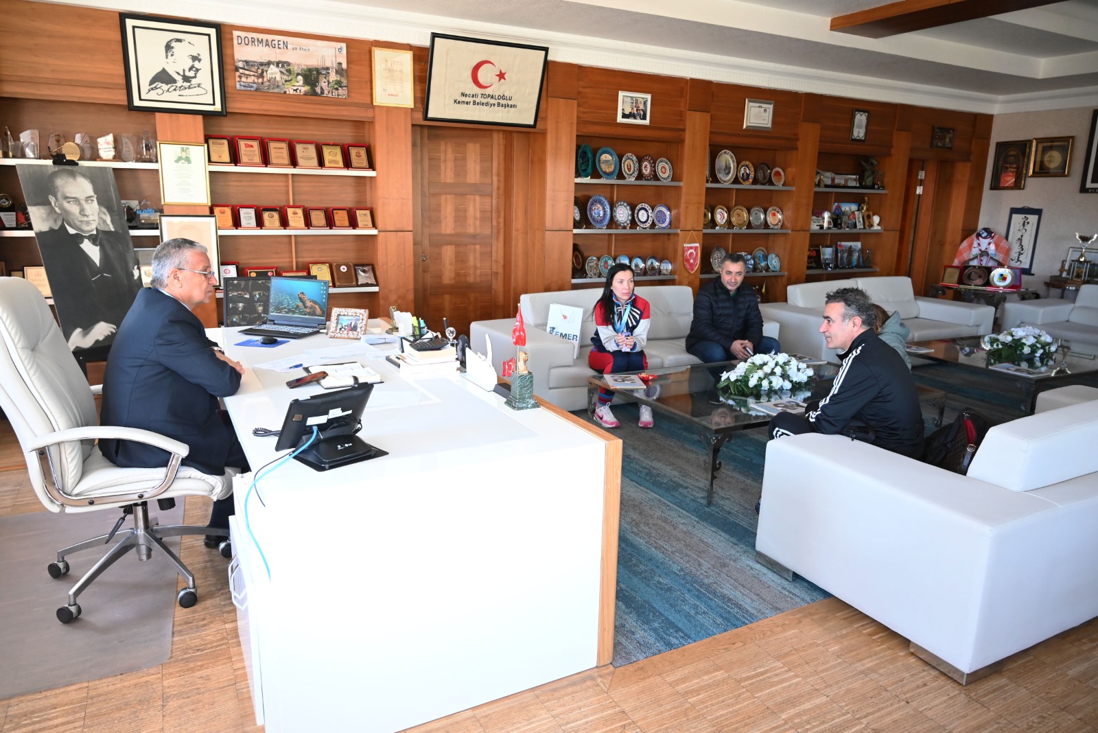 Kemer Belediye Başkanı Necati Topaloğlu öncülüğünde kurulan Kemer Belediyesi Karate Takımı sporcularından Nastasia Florova, Kemer Belediyesi Karate Takımı Antrenörü Emin Akar ile Başkan Topaloğlu'nu ziyaret etti. Ziyarette, Kemer Belediye Meclis Üyesi Ali Akar da yer aldı.