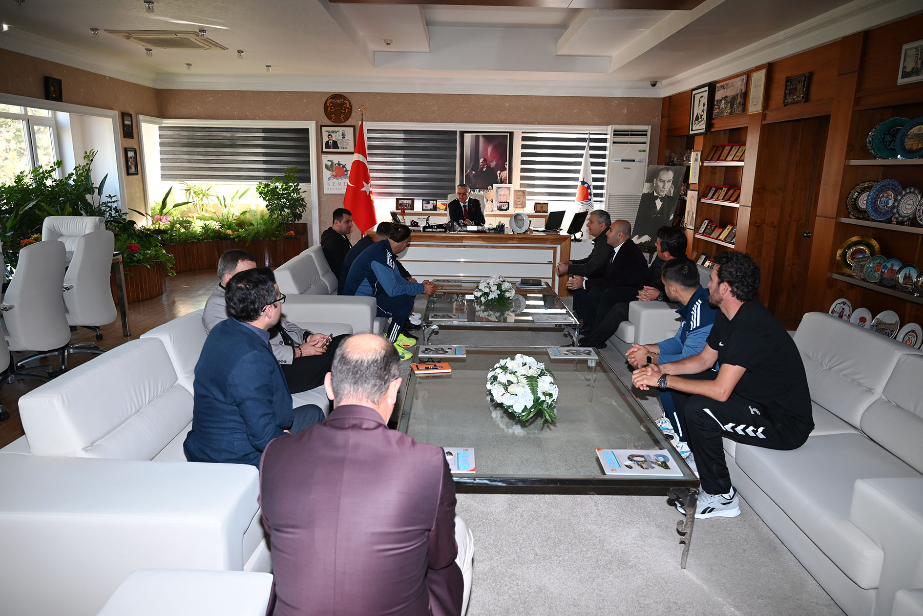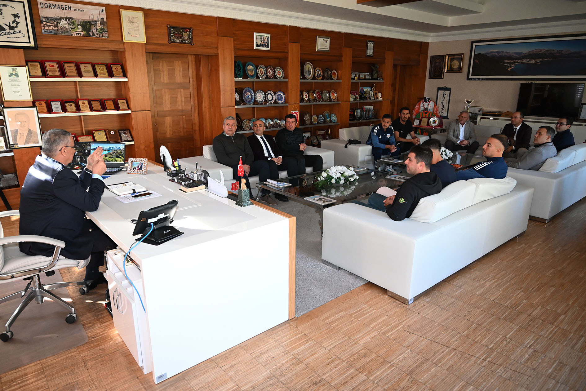 Kulüp yönetiminin Başkan Topaloğlu'nu ziyareti sırasında Kemer Belediye Başkan Yardımcıları Emin Gül İle Semih Top, Kemer Belediye Merkez Spor Kulüp Başkanı Ayhan Süel ve yönetim kurulu üyeleri, Teknik Direktörler Tayfun Yaz, İskender Gökcan, Melih Bildiş, kaleci antrenörü Erkan Polat ve Nurullah Çelik'in babası Sıtkı Çelik de yer aldı.