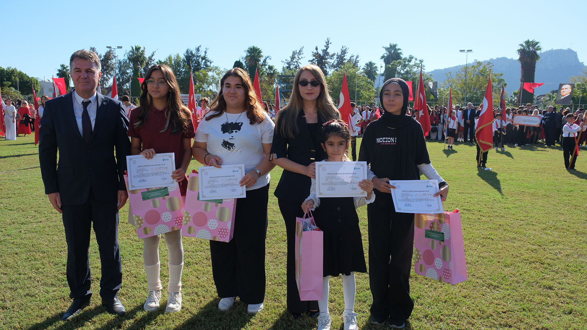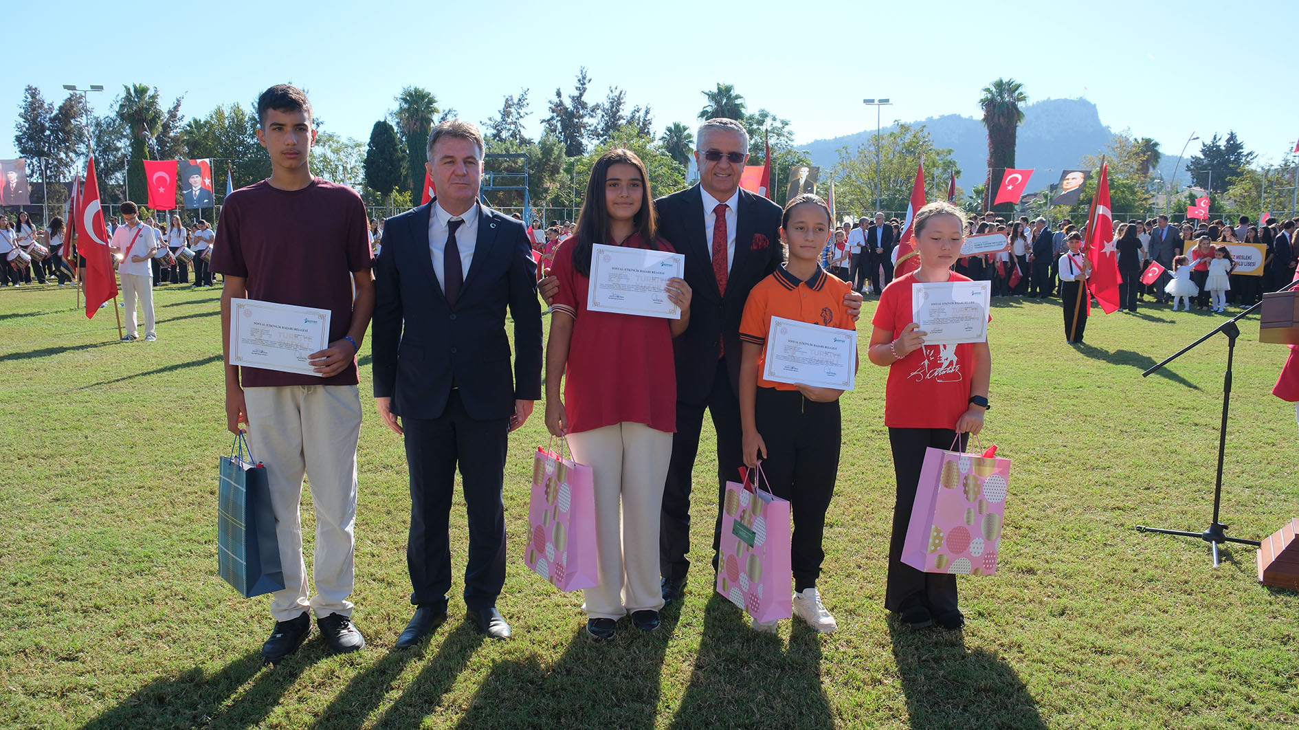Cumhuriyet konulu şiir, resim ve kompozisyon yarışmalarında dereceye giren öğrencilere ödüllerinin verildiği programda öğrencilerin ödüllerini Kemer Kaymakamı Ahmet Solmaz, Kemer Belediye Başkanı Necati Topaloğlu ve Kemer Cumhuriyet Başsavcısı Gamze Almalı verdi.