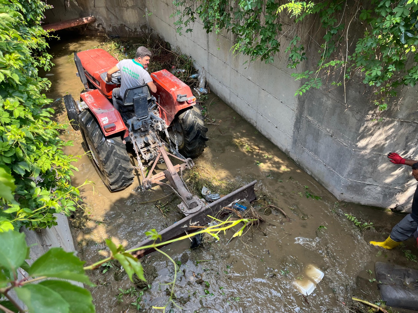 Temizlik çalışmaları kapsamında dere içindeki yosunlar, plastik atıklar ve diğer çöpleri temizleyen belediye ekipleri, ilçe genelindeki kaldırım ve yol kenarlarında büyüyen otları da tırpanladı.