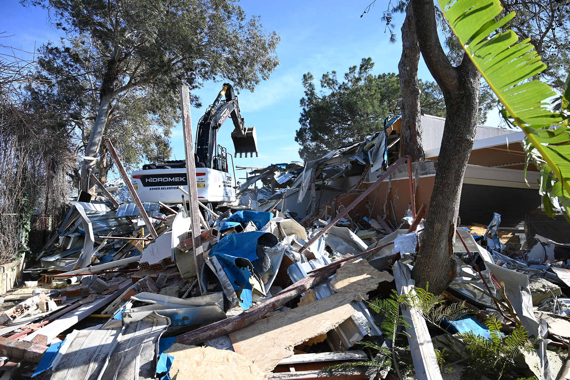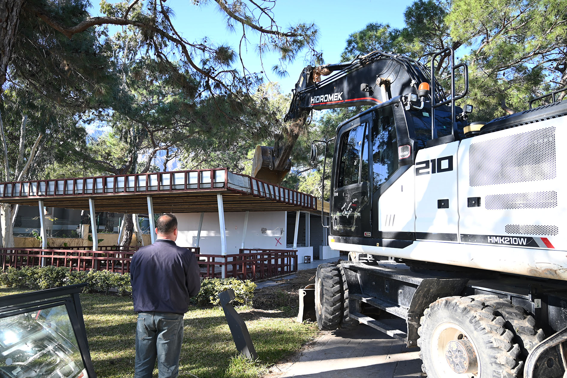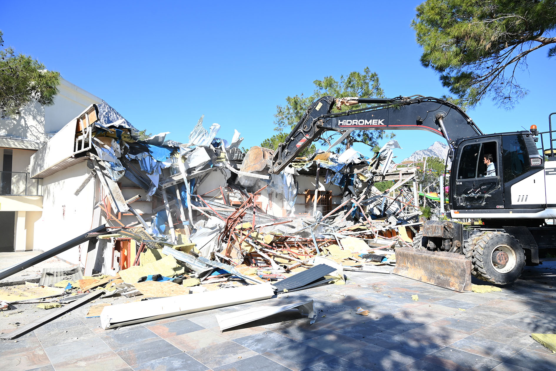 Kemer Belediyesi, Göynük Mahallesi'nde yer alan bir otelde tespit edilen kaçak yapıların yıkımını sürdürüyor.
