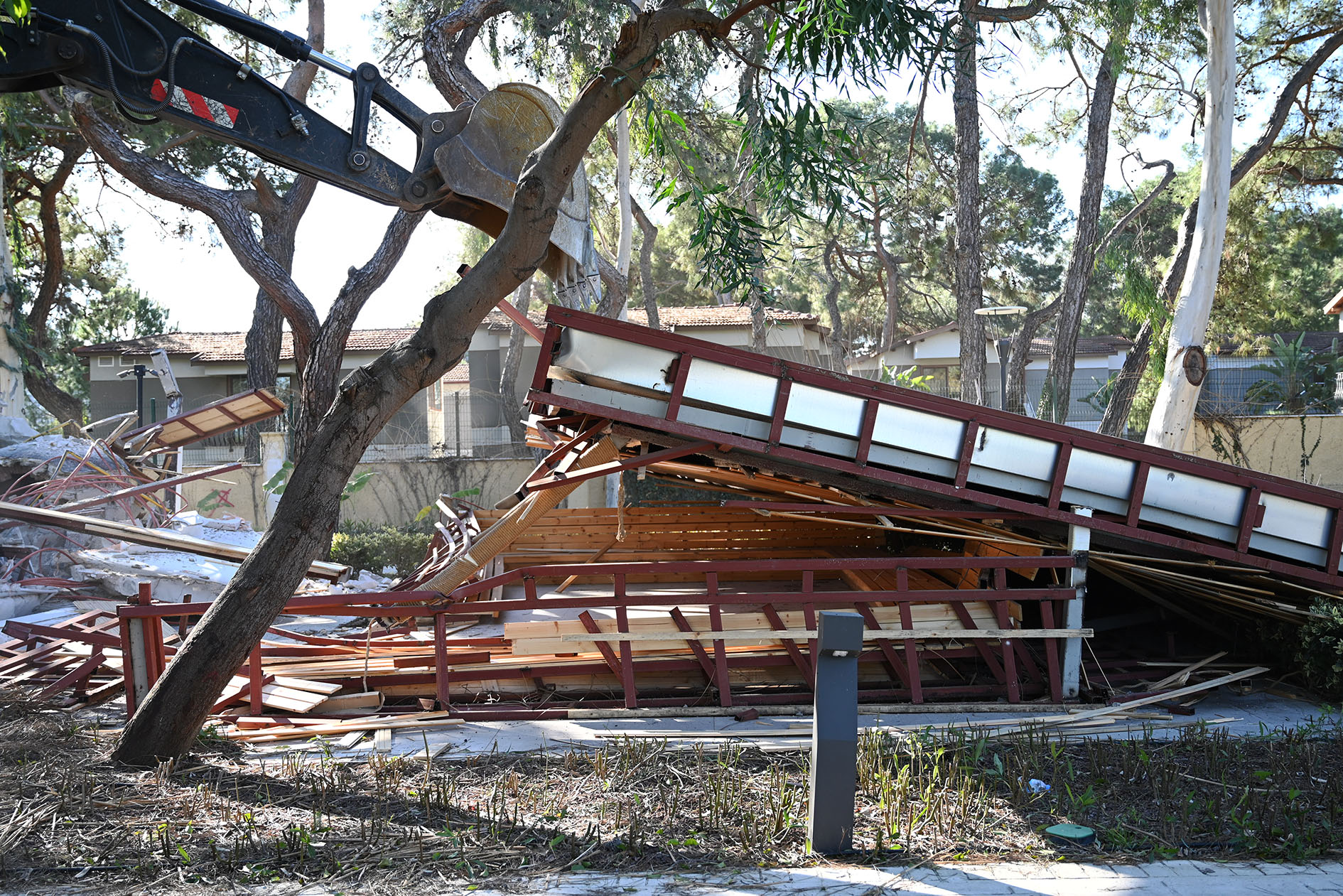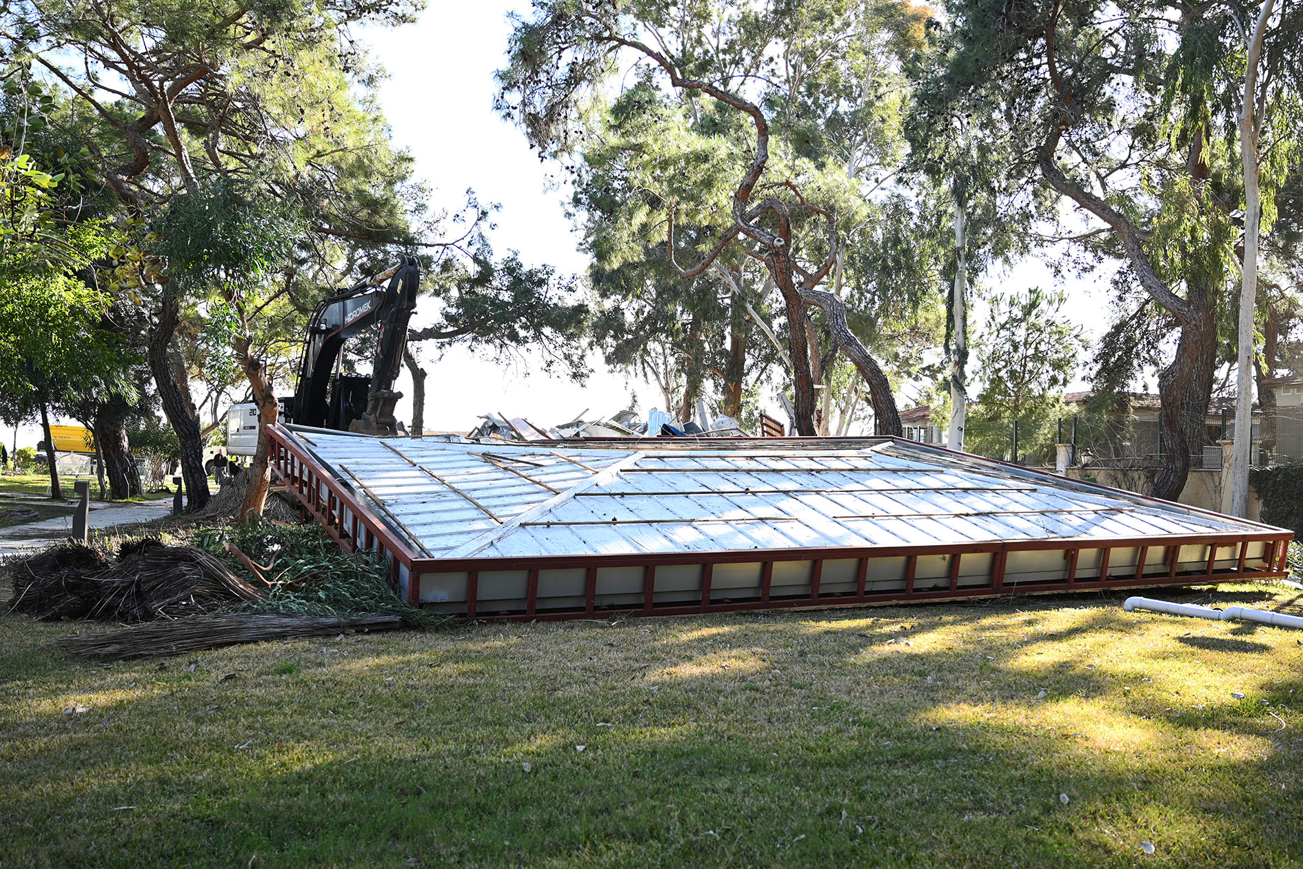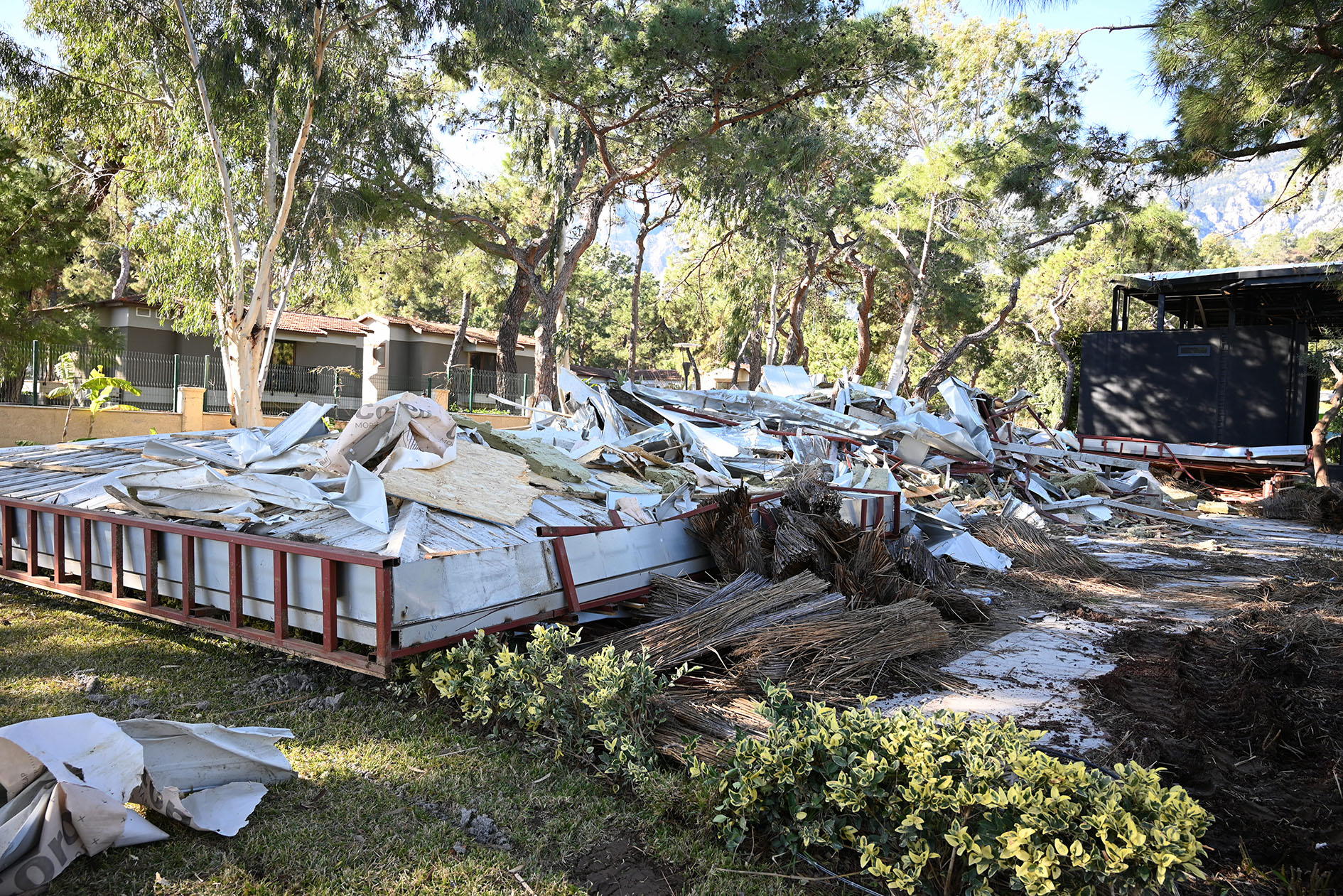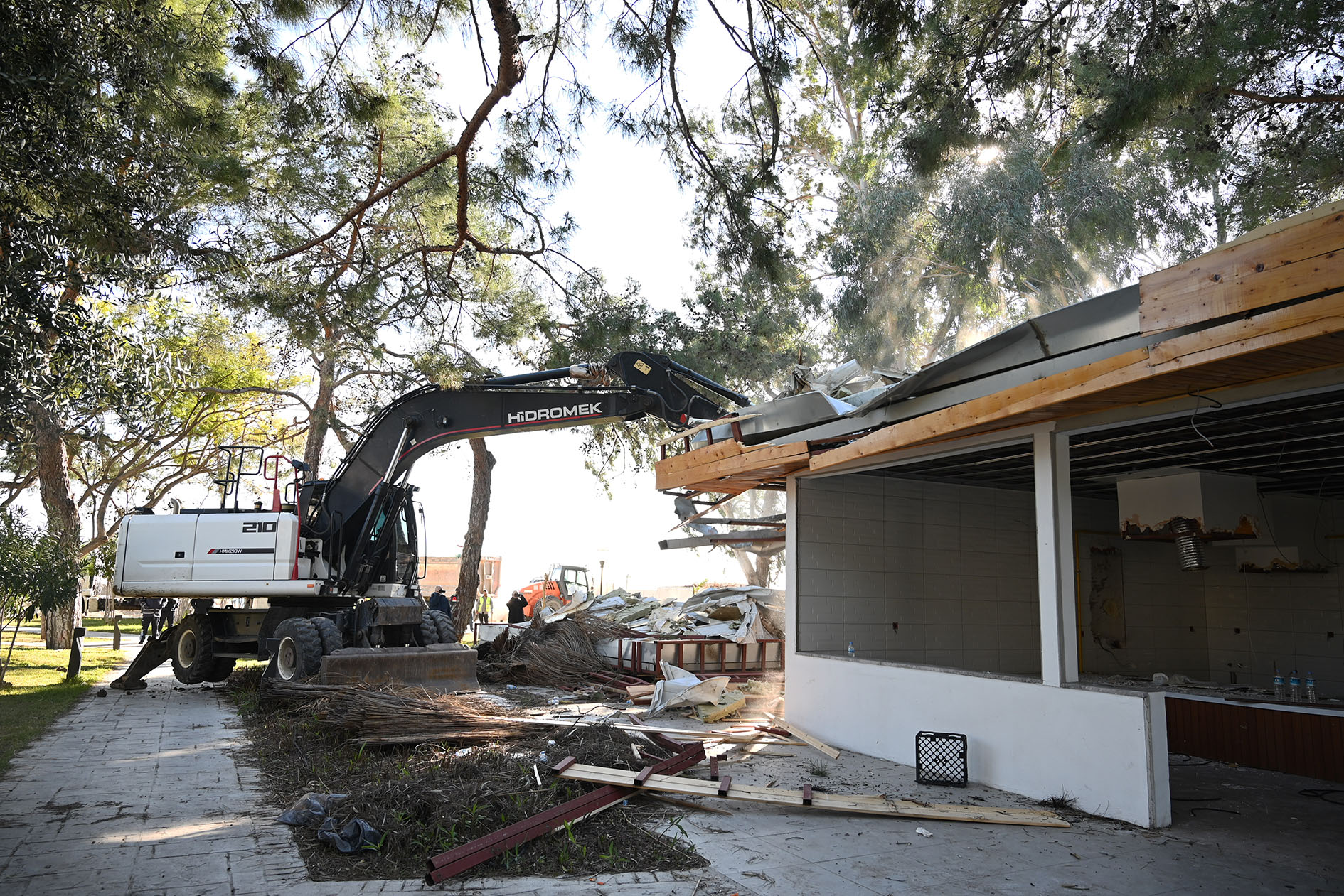 Cuma günü başlanan yıkıma bugün de devam edildi. Yıkımları engellemek için söz konusu otelin girişine park edilen kamyon ve tırlar, jandarma eşliğinde çekicilerle bulundukları yerden kaldırıldı.