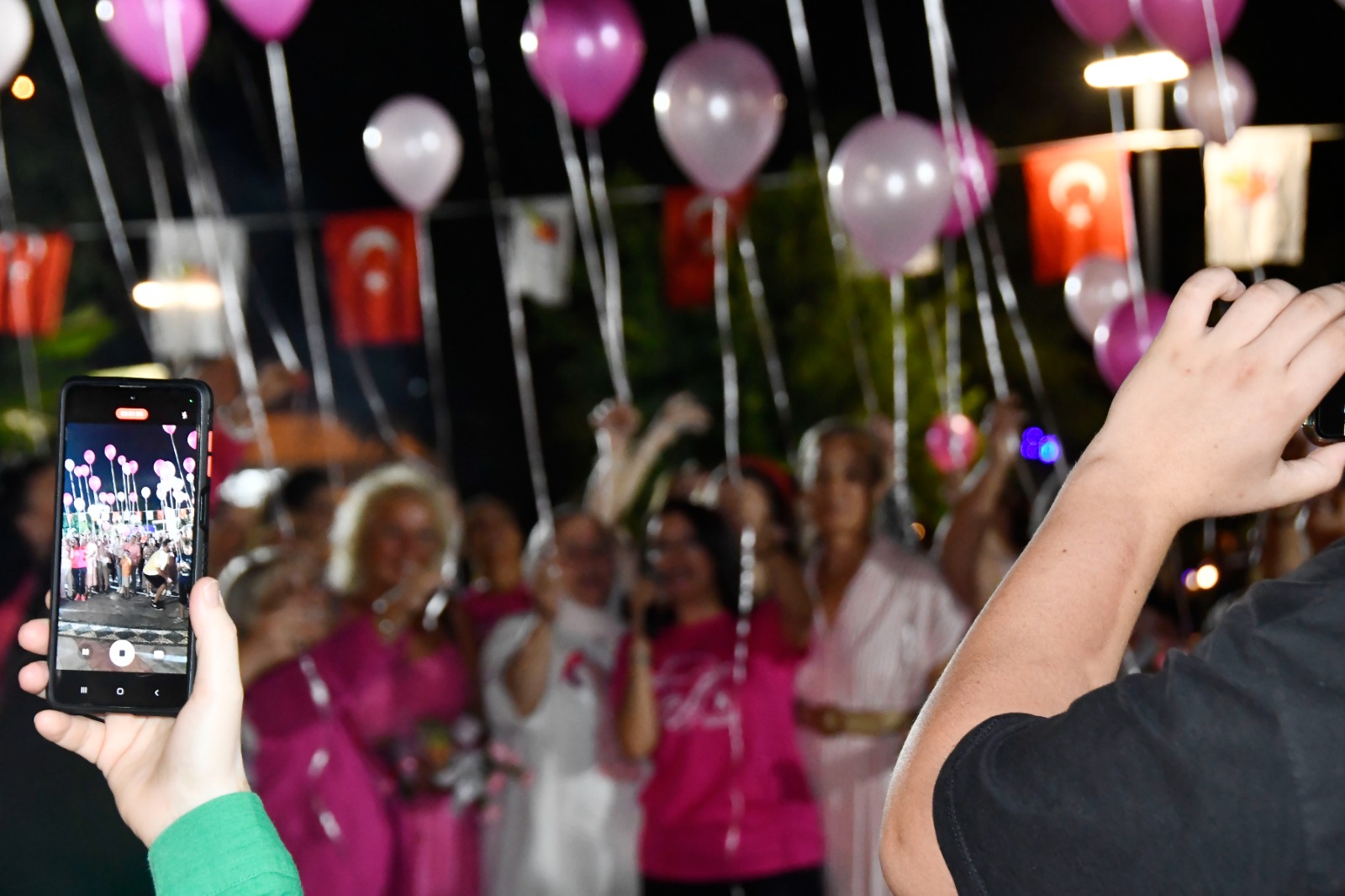 Belediye Başkanı Topaloğlu, Belediye Başkan Yardımcısı Emin Gül, Başkan Topaloğlu'nun eşi ve beraberindekiler, meme kanserine dikkat çekmek ve farkındalık oluşturmak amacıyla gökyüzüne 150 balon uçurdu.