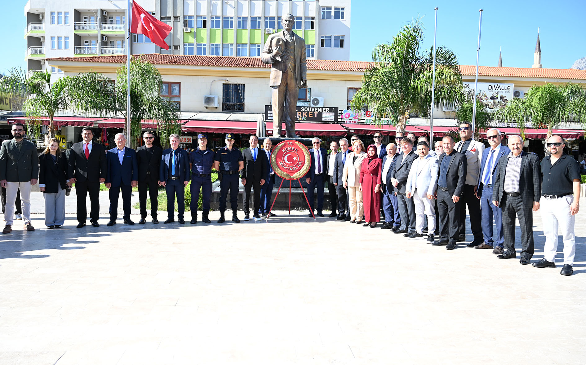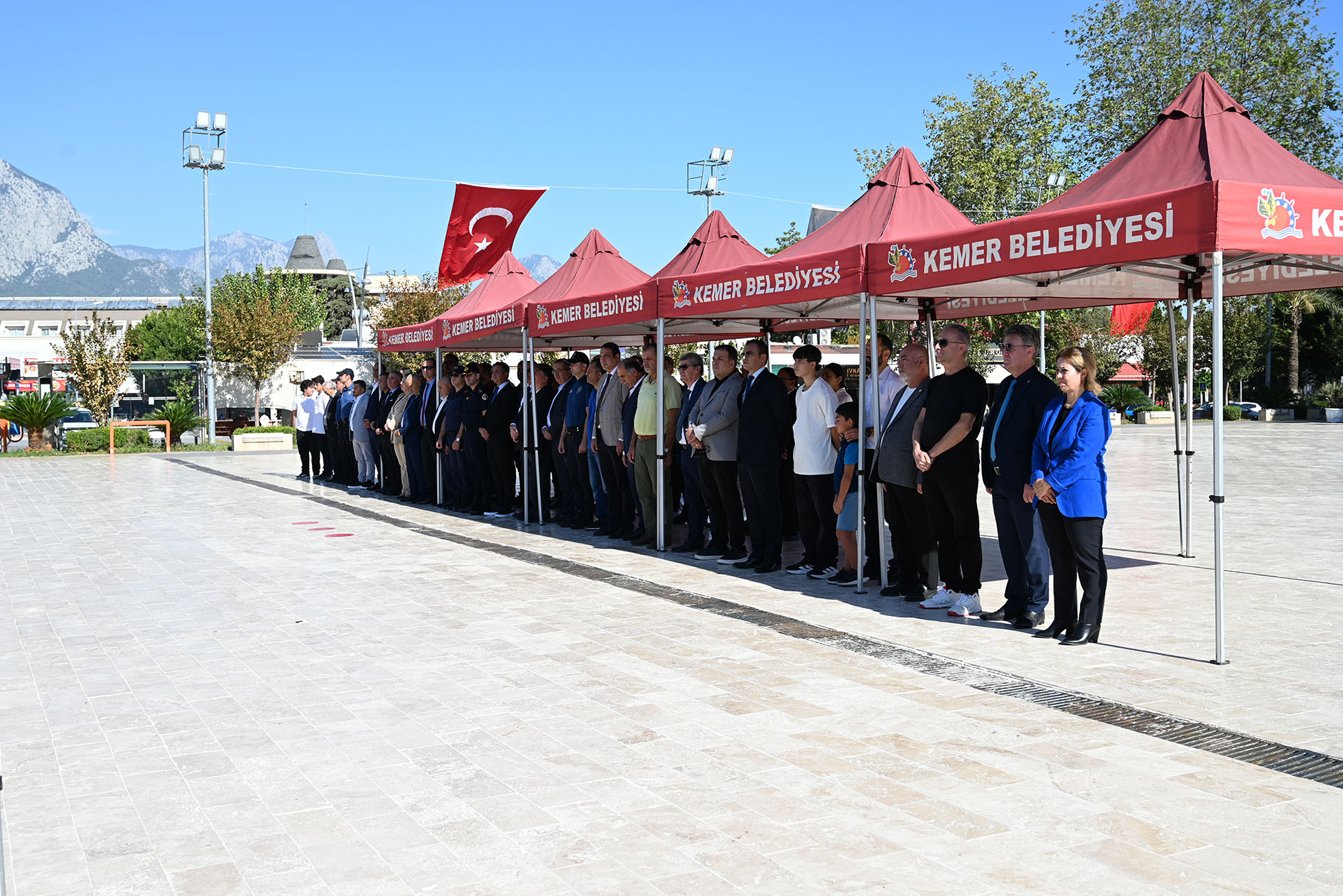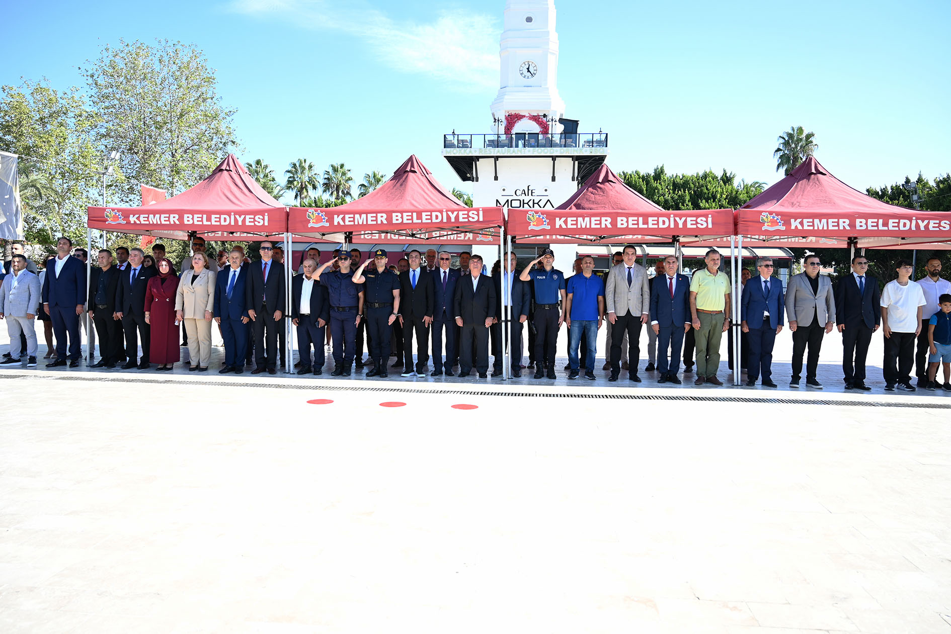 Kemer Cumhuriyet Meydanı'nda düzenlenen törene, Kemer Belediye Başkanı Necati Topaloğlu, Kemer Jandarma Komutanı Ömer Seyhan, Kemer Belediye Başkan Yardımcısı Semih Top, Kemer Sahil Güvenlik Komutanı Burak Gökçe Gökmen, Kemer Belediye Meclis Üyesi Mustafa Bilici, Arslanbucak Mahalle Muhtarı Pınar Balaman, Beldibi Mahalle Muhtarı Bayram Ali Talih, Beycik Mahalle Muhtarı Caner Kavuz, Çamyuva Mahalle Muhtarı Rıdvan Vicir, Göynük Mahalle Muhtarı Sadık Şen, Kiriş Mahalle Muhtarı Faiz Çetin, Kuzdere Mahalle Muhtarı Serkan Günay, Merkez Mahalle Muhtarı Yusuf Salova, Ovacık Mahalle Muhtarı İsa Anatürk, Tekirova Mahalle Muhtarı Mustafa Barış, Ulupınar Mahalle Muhtarı Salih Sarıca, Yeni Mahalle Muhtarı Münevver Erkal, STK temsilcileri, siyasi parti temsilcileri ile kamu kurum ve kuruluşlarının temsilcileri katıldı.