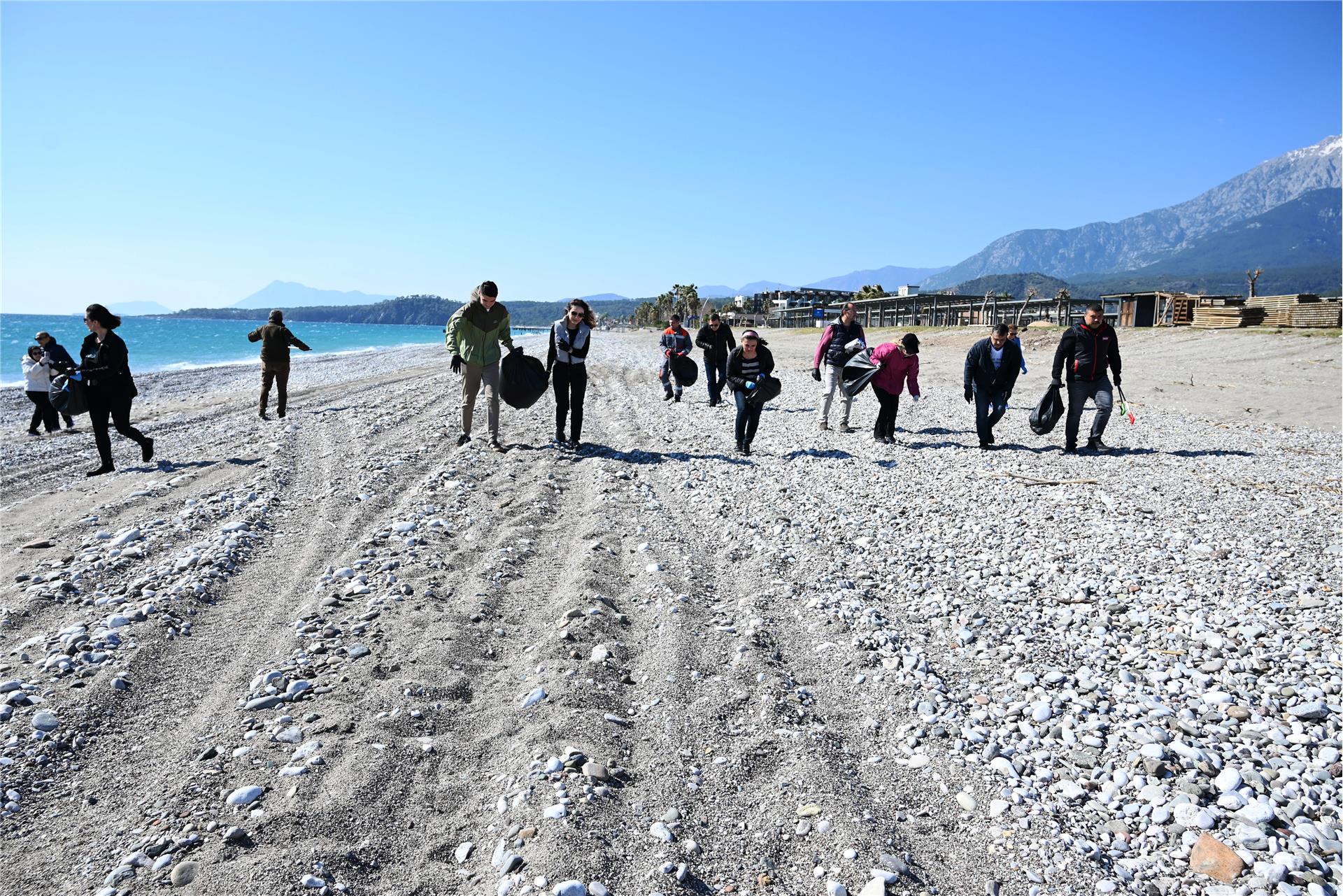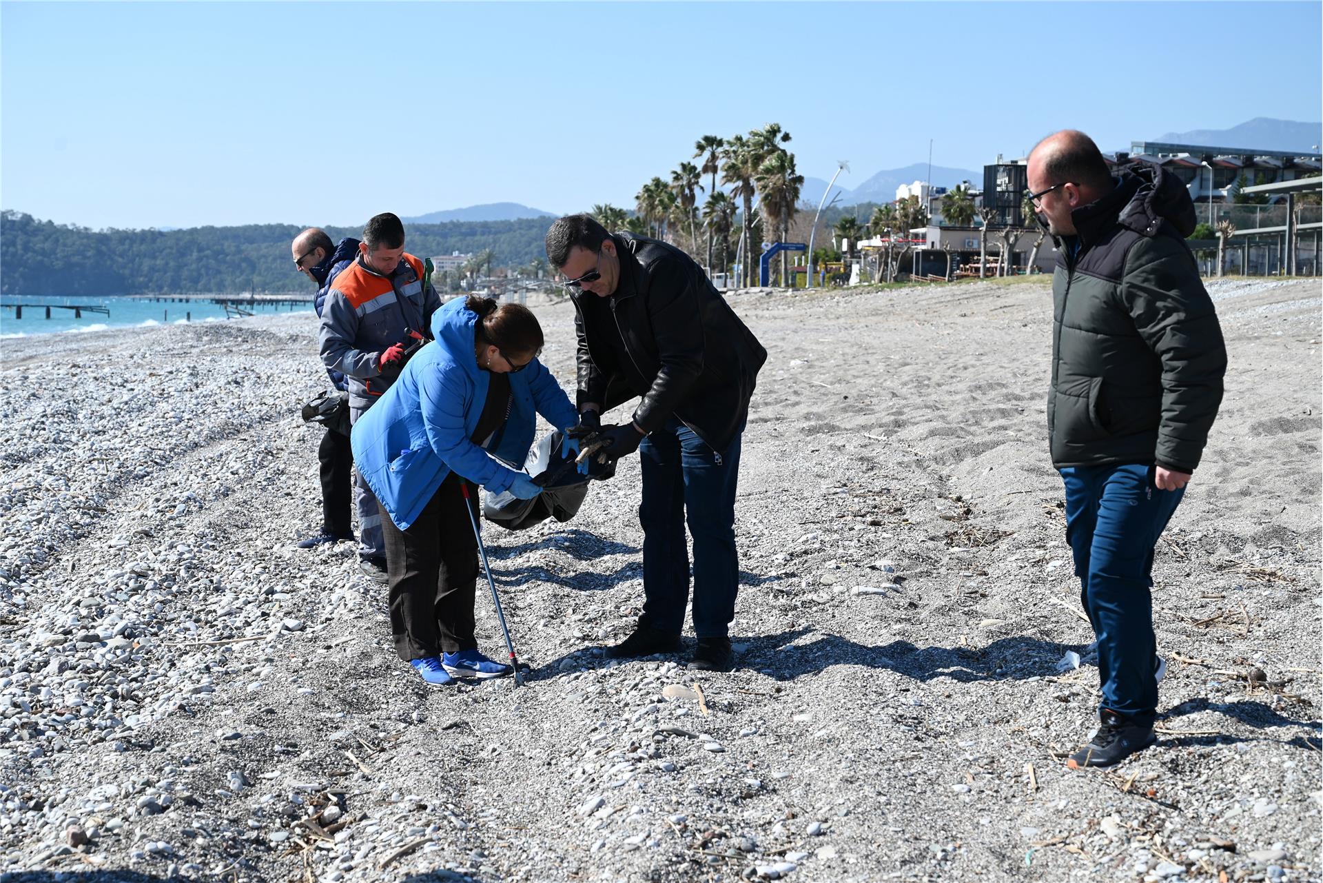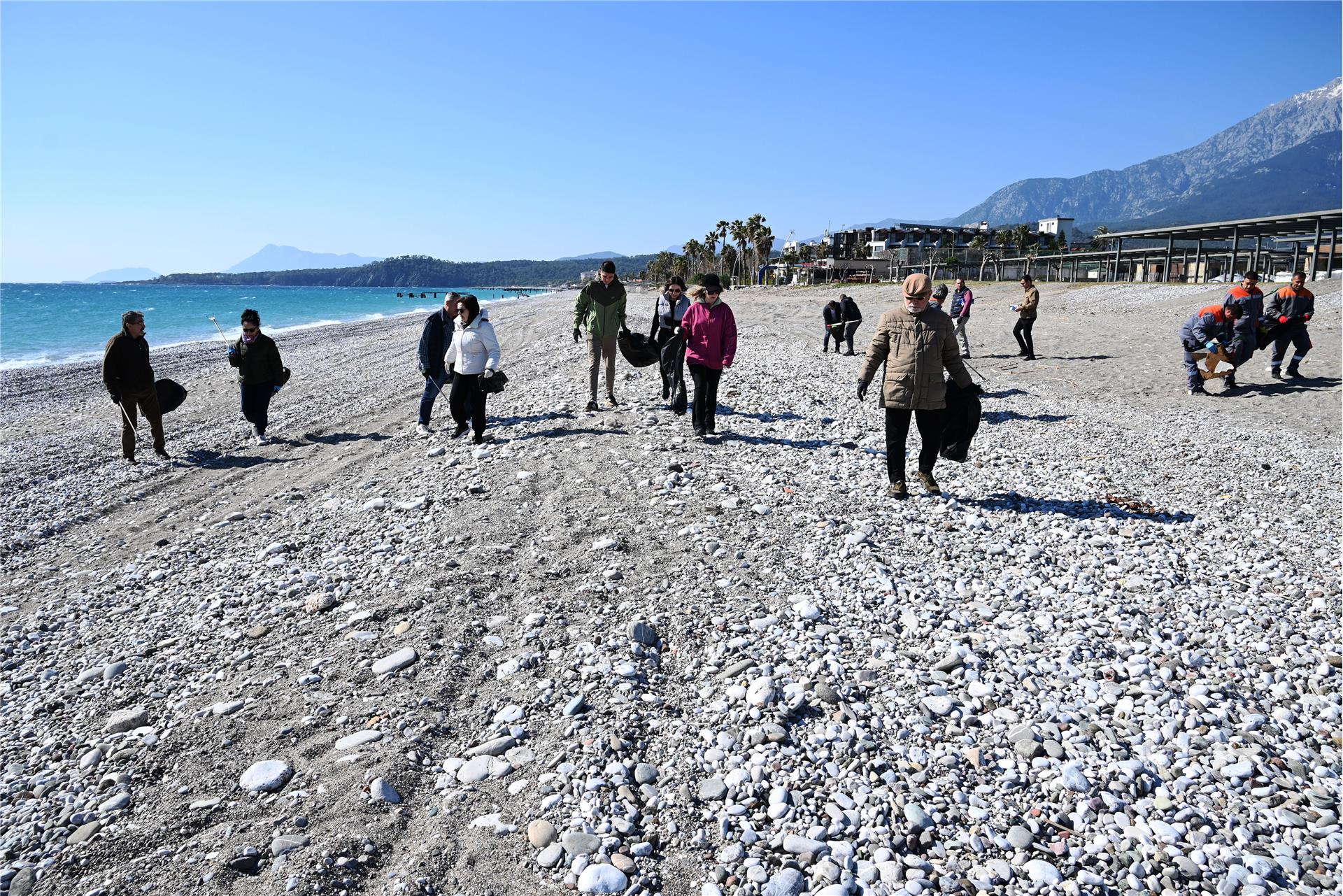 Çamyuva sahilinde yapılan temizlik etkinliğine katılanlar, Kemer Belediyesi Temizlik İşleri Müdürlüğü ile İklim Değişikliği ve Sıfır Atık Müdürlüğü ekipleri tarafından dağıtılan eldiven ve çöp poşetlerini alarak sahildeki atık ve çöpleri temizledi.