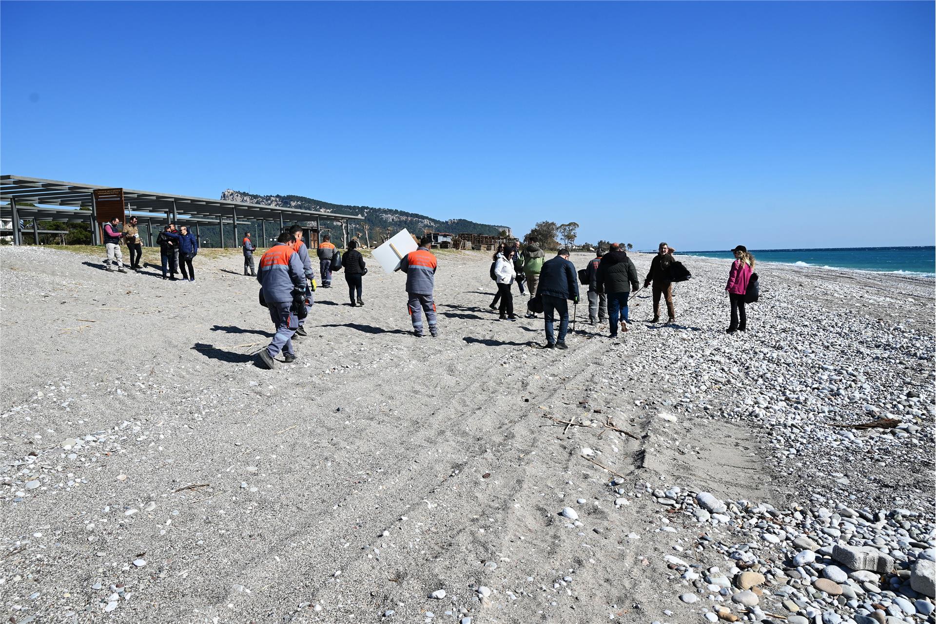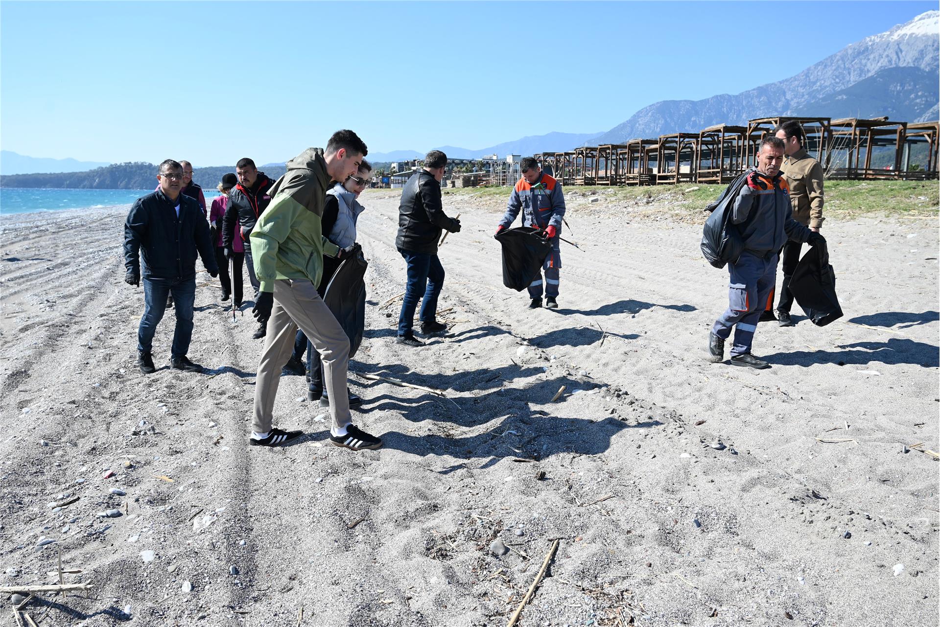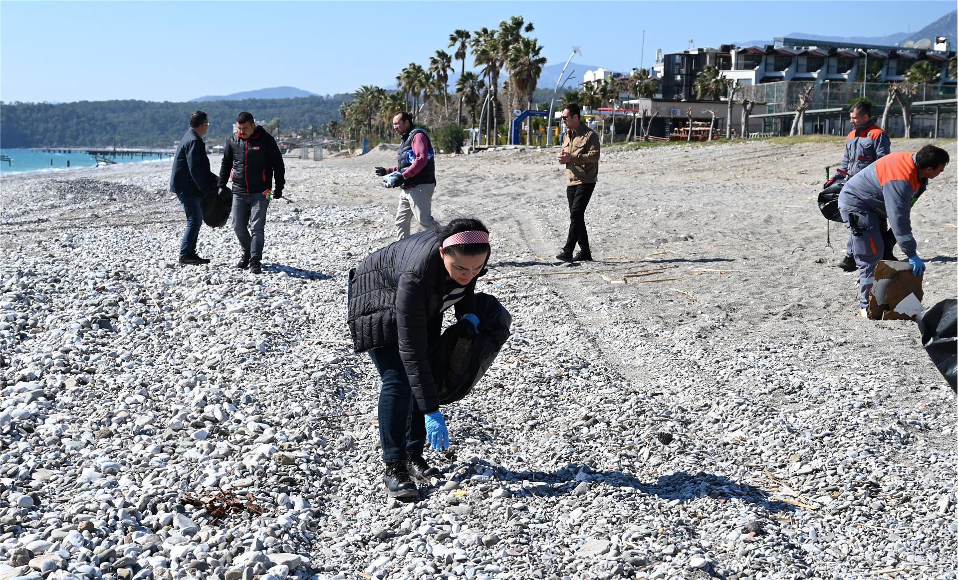 Çamyuva sahilinde yapılan temizlik etkinliğine katılanlar, Kemer Belediyesi Temizlik İşleri Müdürlüğü ile İklim Değişikliği ve Sıfır Atık Müdürlüğü ekipleri tarafından dağıtılan eldiven ve çöp poşetlerini alarak sahildeki atık ve çöpleri temizledi.