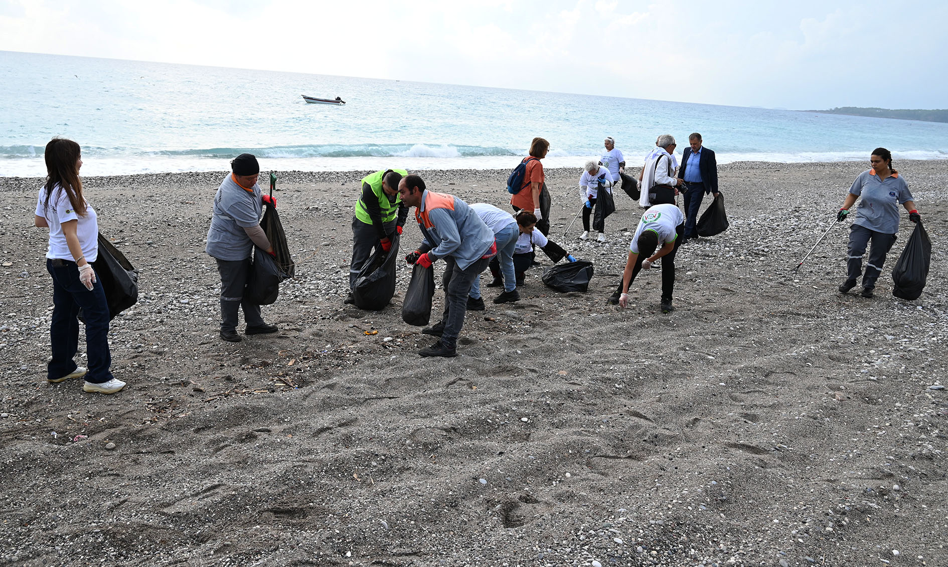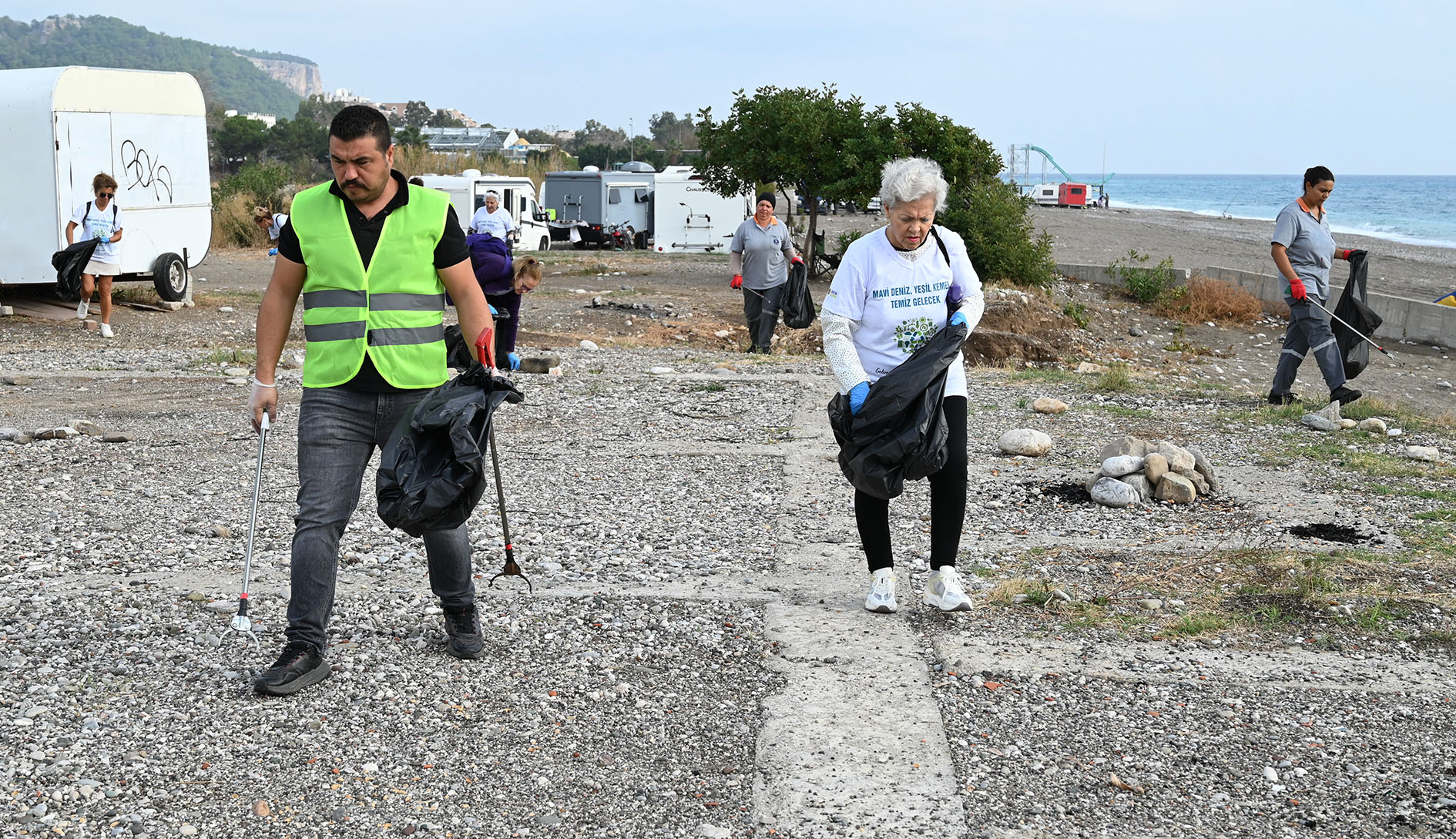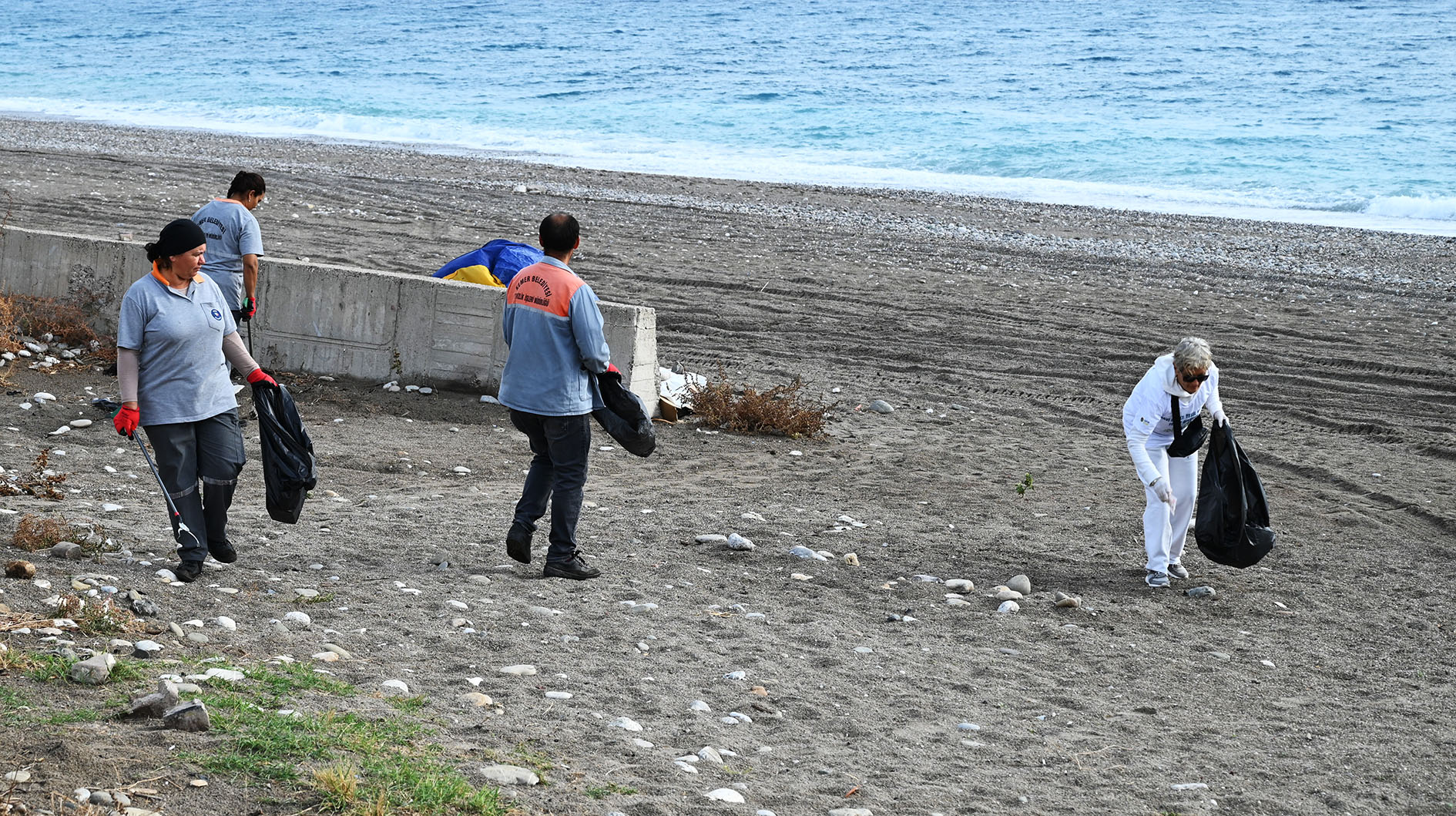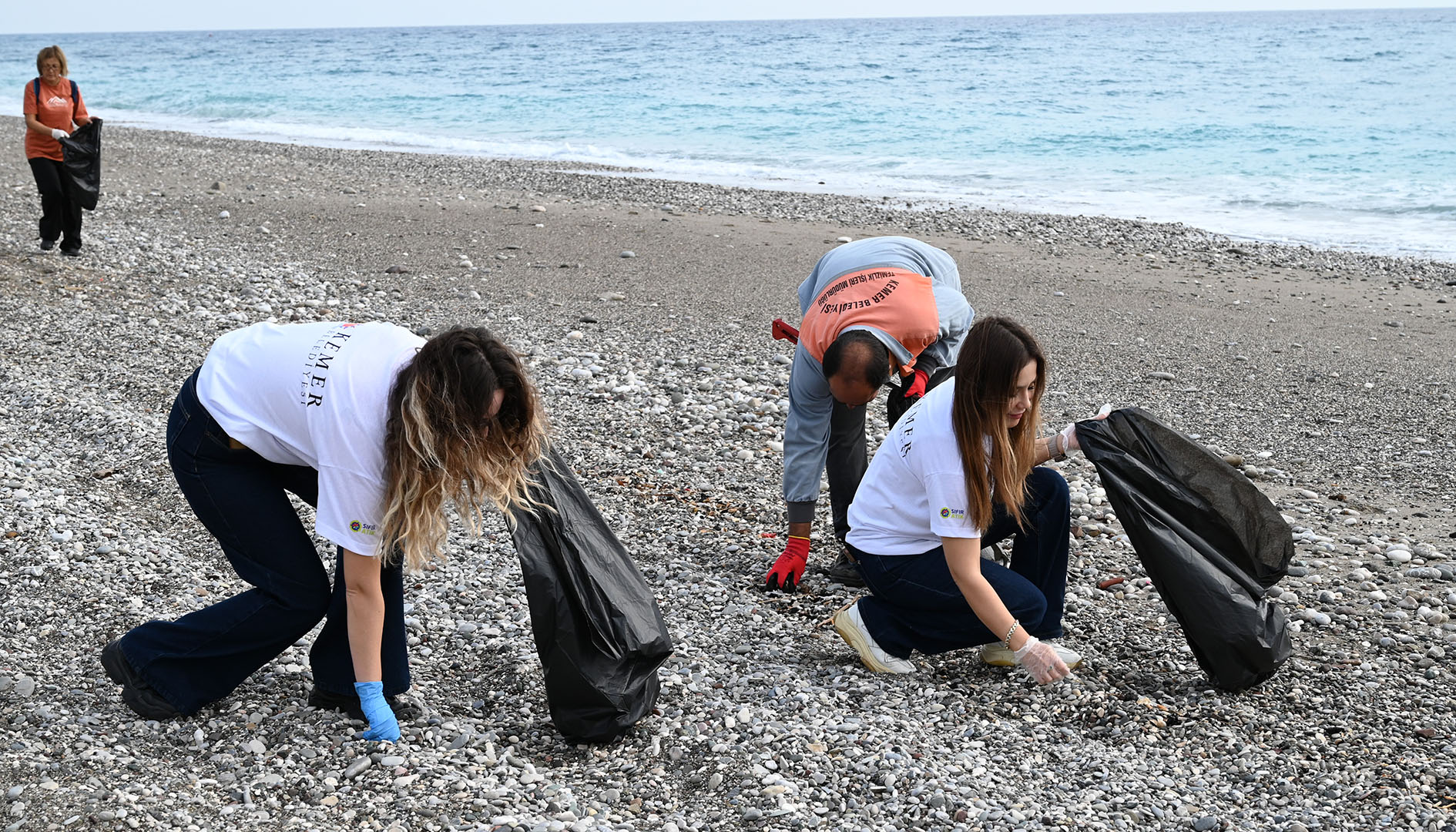 Etkinliğe katılanlar, Kemer Belediyesi Temizlik İşleri Müdürlüğü ile İklim Değişikliği ve Sıfır Atık Müdürlüğü ekipleri tarafından dağıtılan eldiven ve çöp poşetlerini alarak sahildeki atık ve çöpleri temizledi.