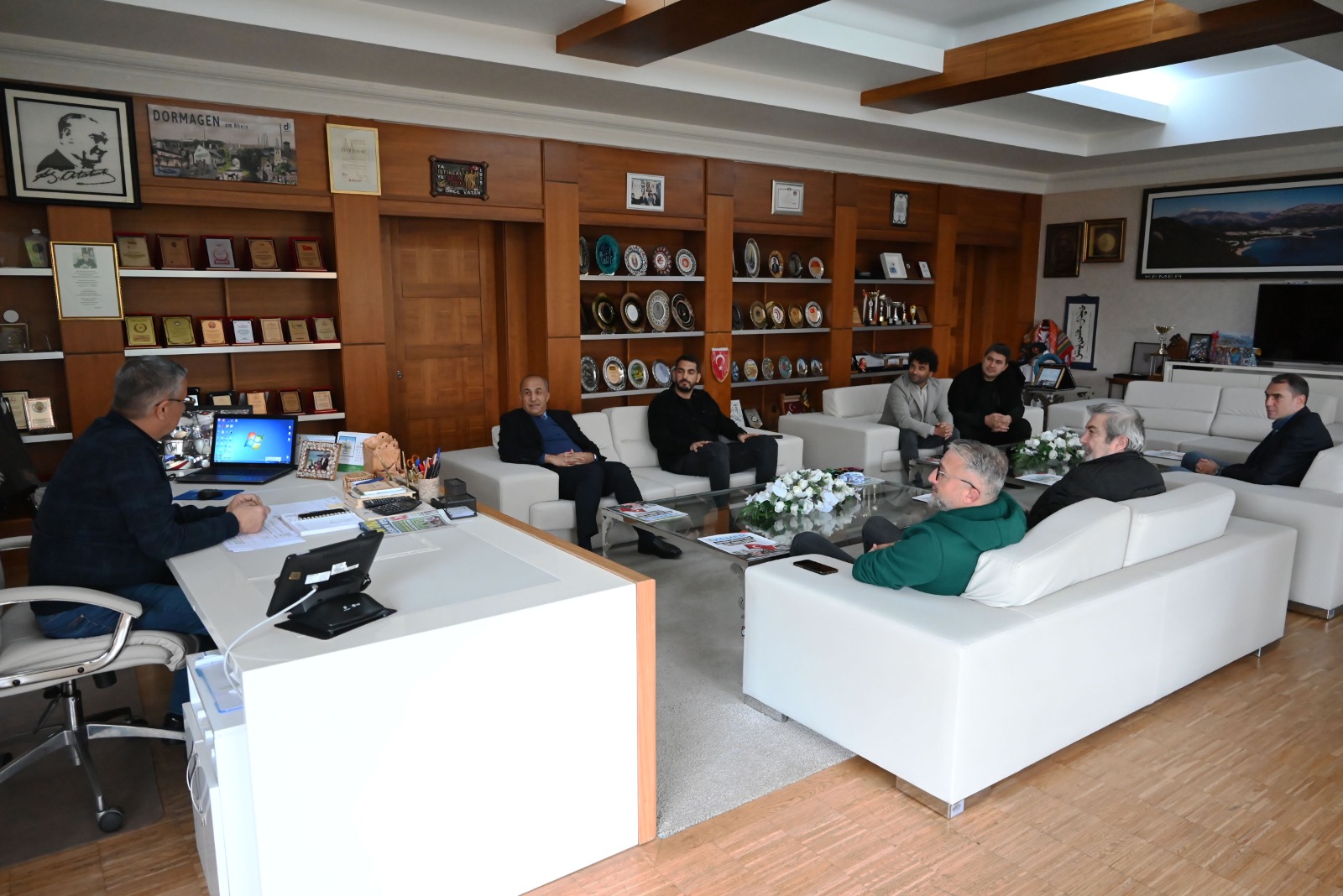 Kemer Turizmci ve İş Adamları Derneği (KEMİAD) Derneği Başkanı Rıza Sönmez ve dernek yönetim kurulu üyeleri, Kemer Belediye Başkanı Necati Topaloğlu'na nezaket ziyaretinde bulundu.