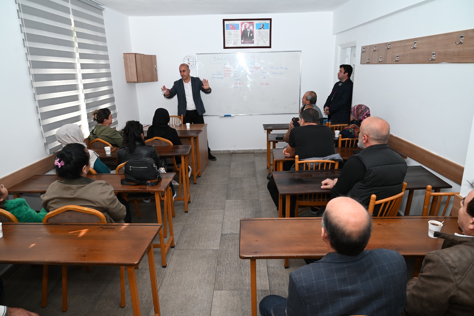 Kemer Belediye Başkanı Necati Topaloğlu'nun eğitime kazandırdığı Kemer Belediyesi Ahmet Erkal Destek Eğitim Kursu'nda üniversite sınavına ücretsiz hazırlanan öğrencilerin velileriyle toplantı gerçekleştirildi.