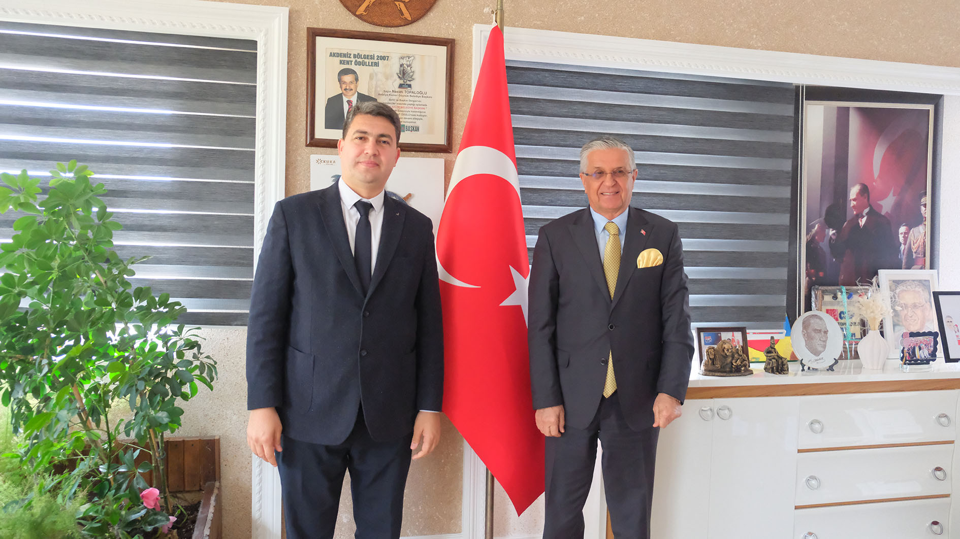 Kemer Esnaf ve Sanatkarlar Odası Başkanı Okay Çelik ve yönetim kurulu üyeleri, Kemer Belediye Başkanı Necati Topaloğlu'nu makamında ziyaret etti.