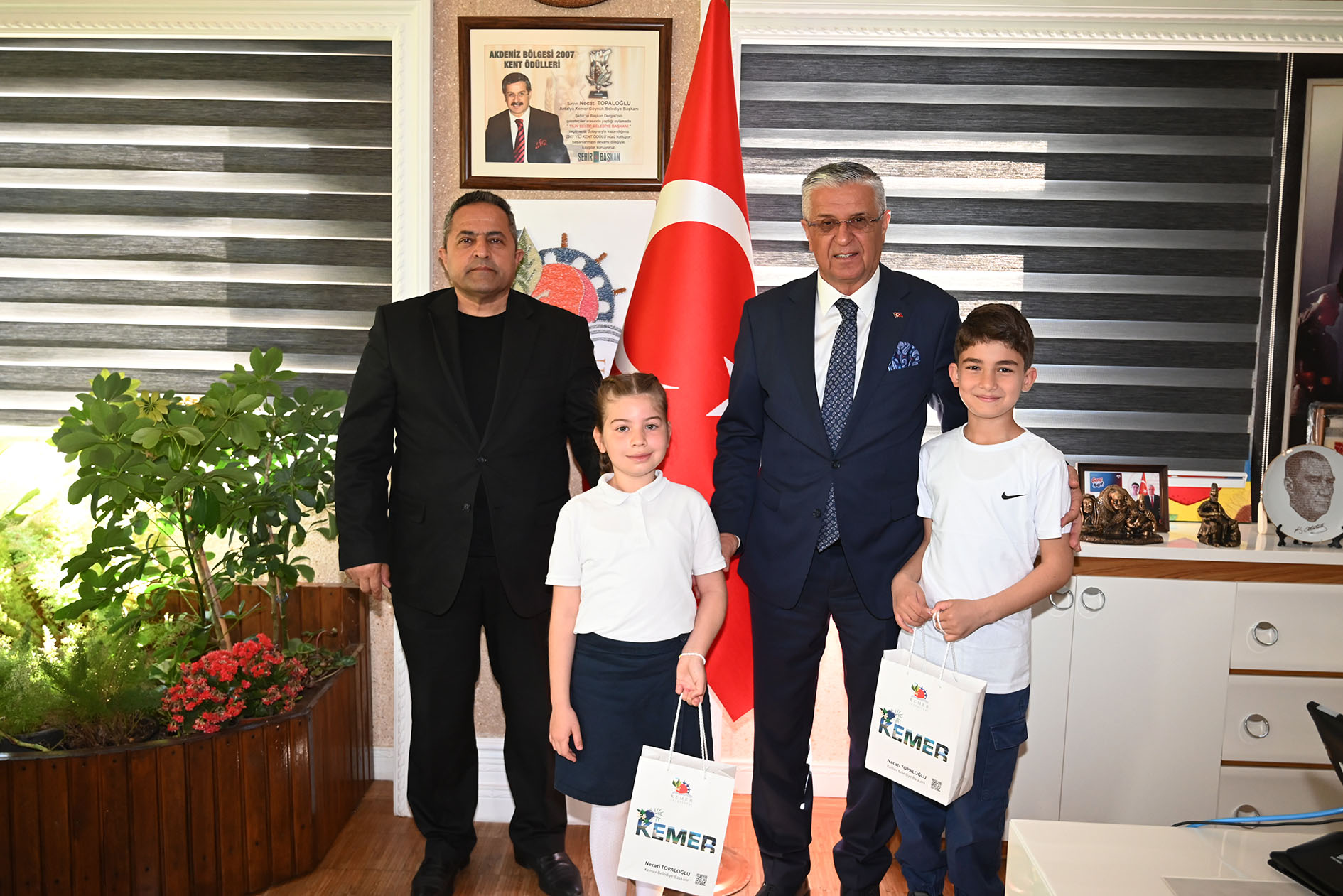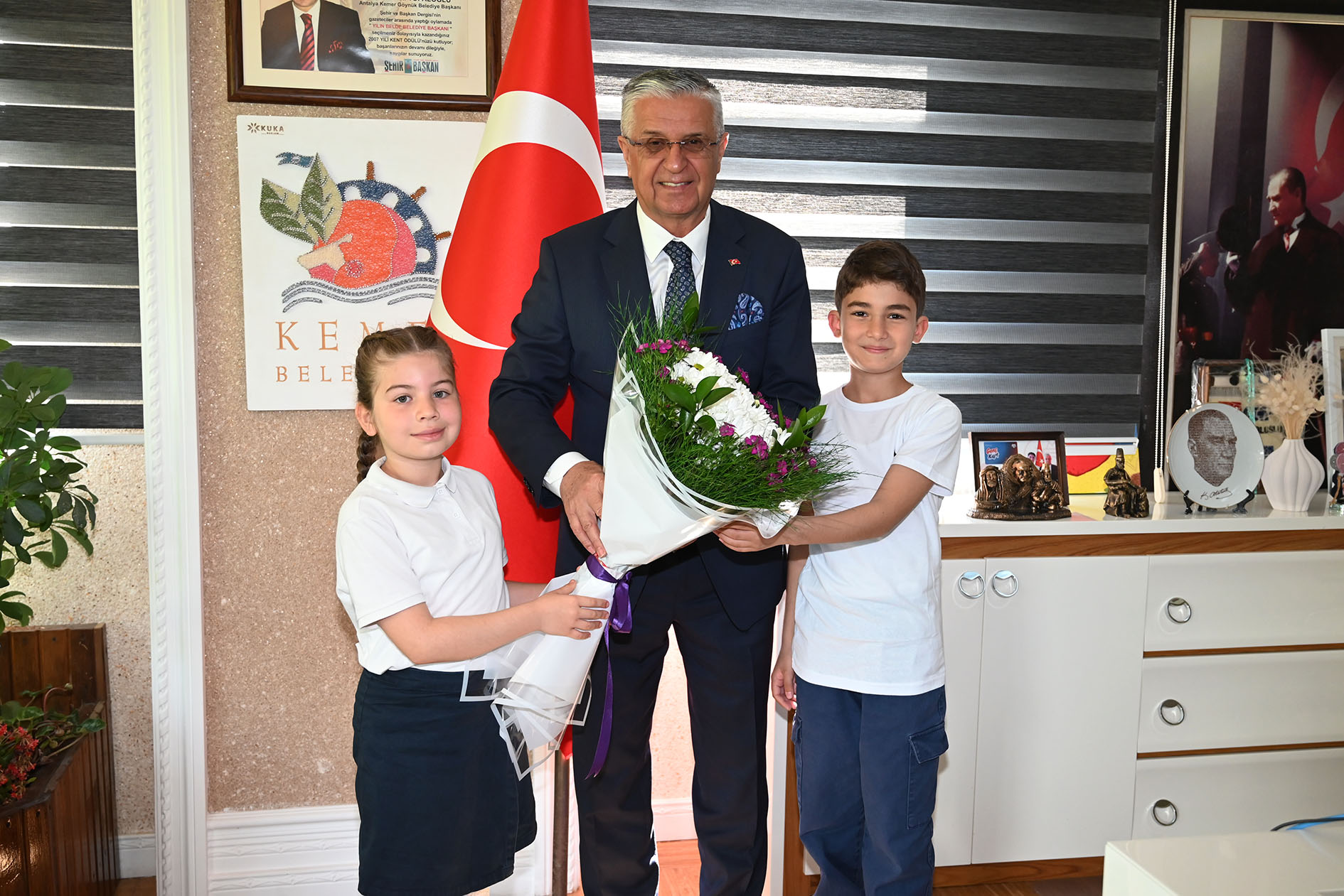 Çamyuva Mahallesi'nde bulunan Silkar İlkokulu 4. sınıf öğrencileri Ela Naz Süzer ve Hüseyin Altuntaş, okul müdürü Veysel Kaya eşliğinde Kemer Belediyesi'ni ziyaret etti.