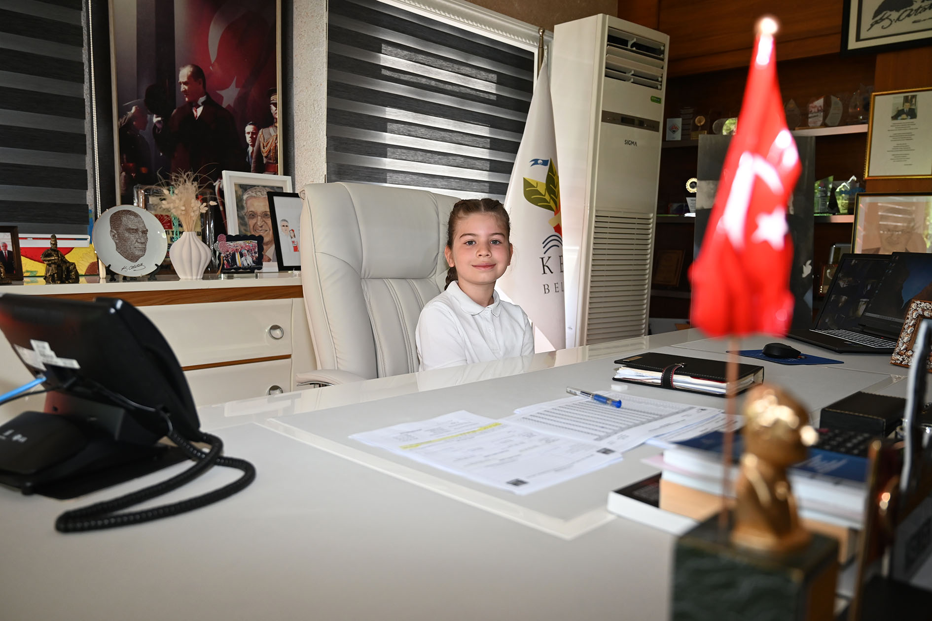 Başkanlık koltuğuna oturan öğrenciler, belediye çalışmalarıyla ilgili taleplerini dile getirdi. Hüseyin Altuntaş, belediye birimleriyle iletişime geçerek 23 Nisan hazırlıklarıyla ilgili evrakları talep ederken; Ela Naz Süzer ise belediye personelinden ikram istedi.