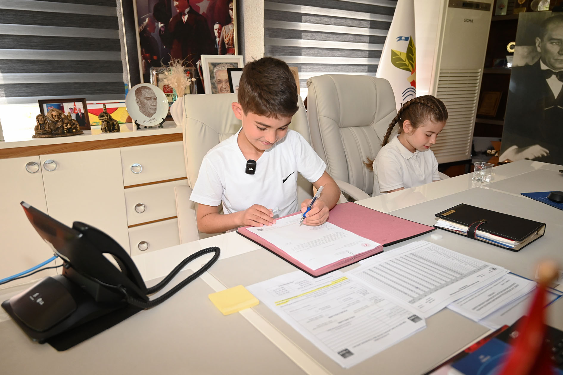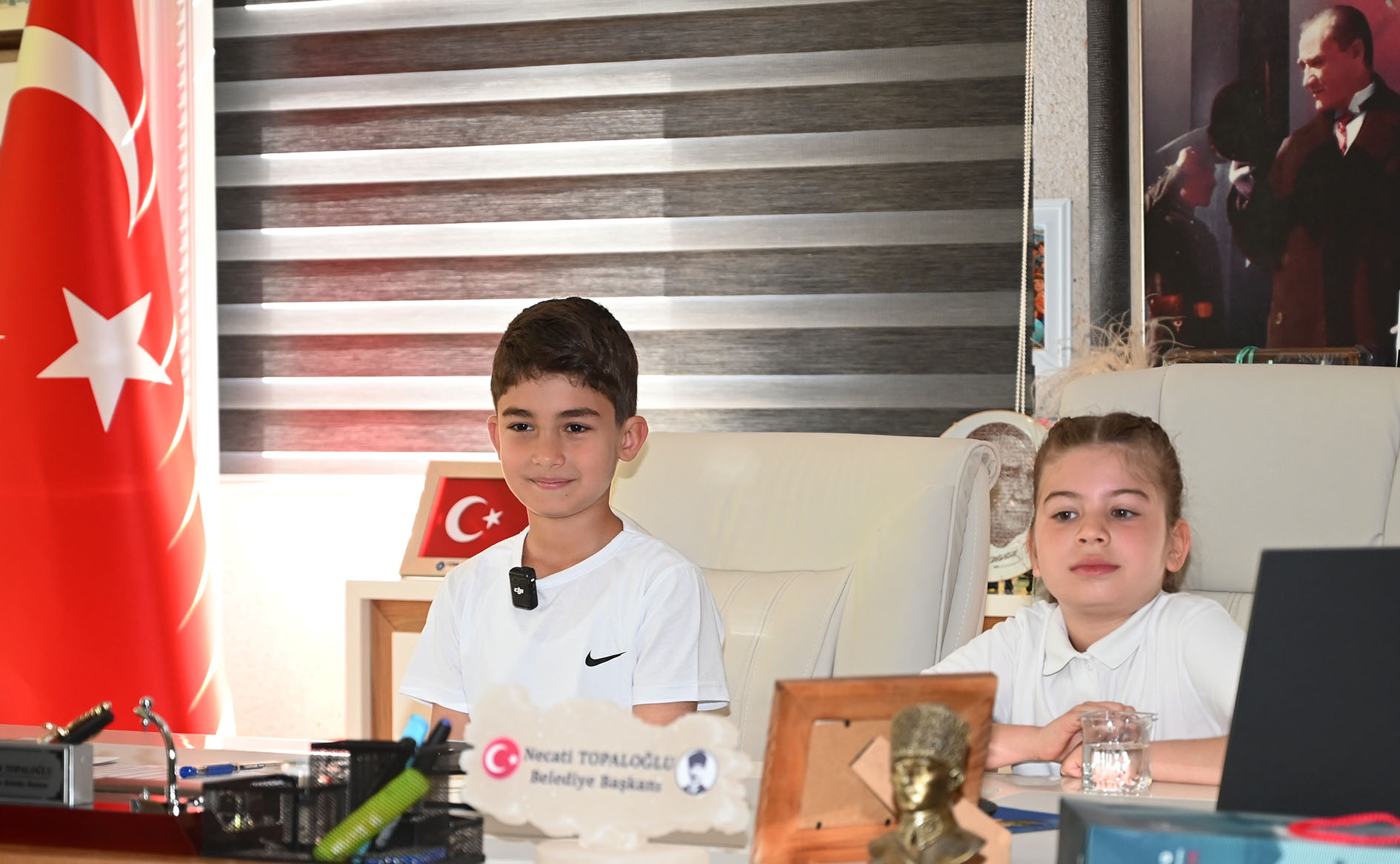 Minik misafirleri makam girişinde karşılayan Başkan Topaloğlu, başkanlık görevini sembolik olarak Ela Naz Süzer ve Hüseyin Altuntaş'a devretti.