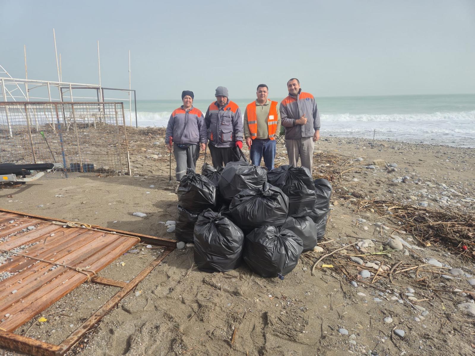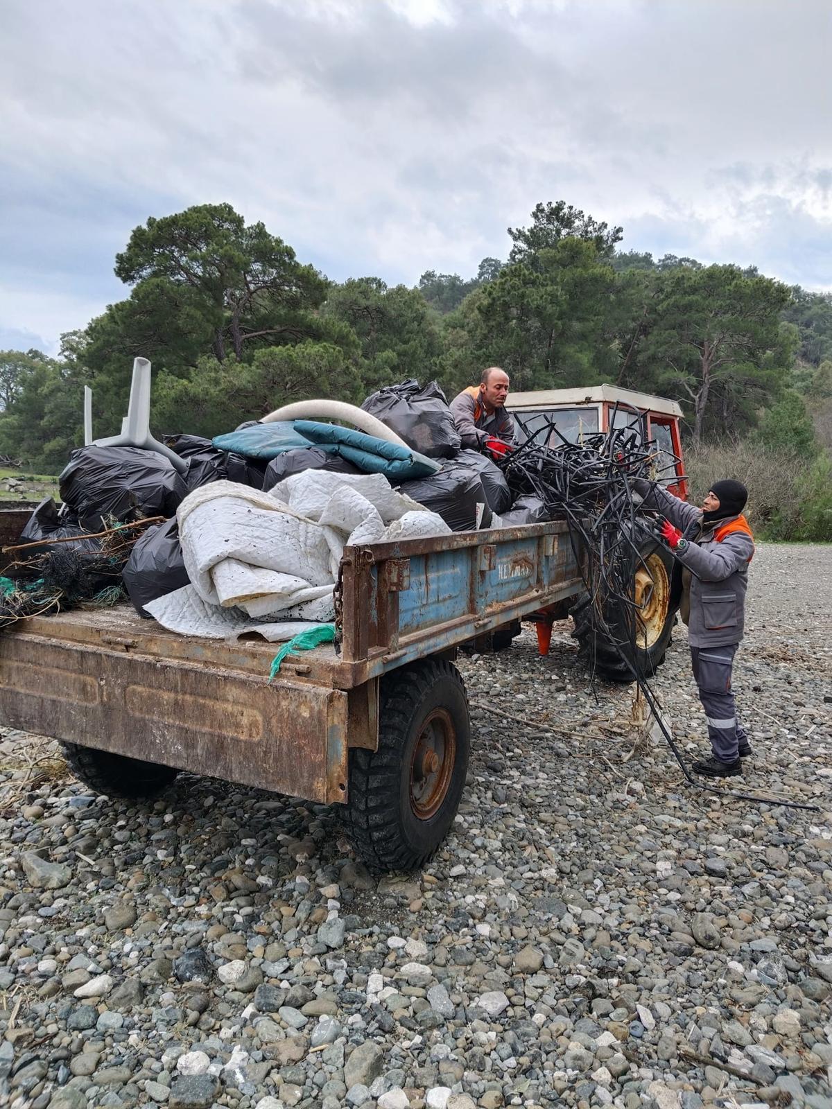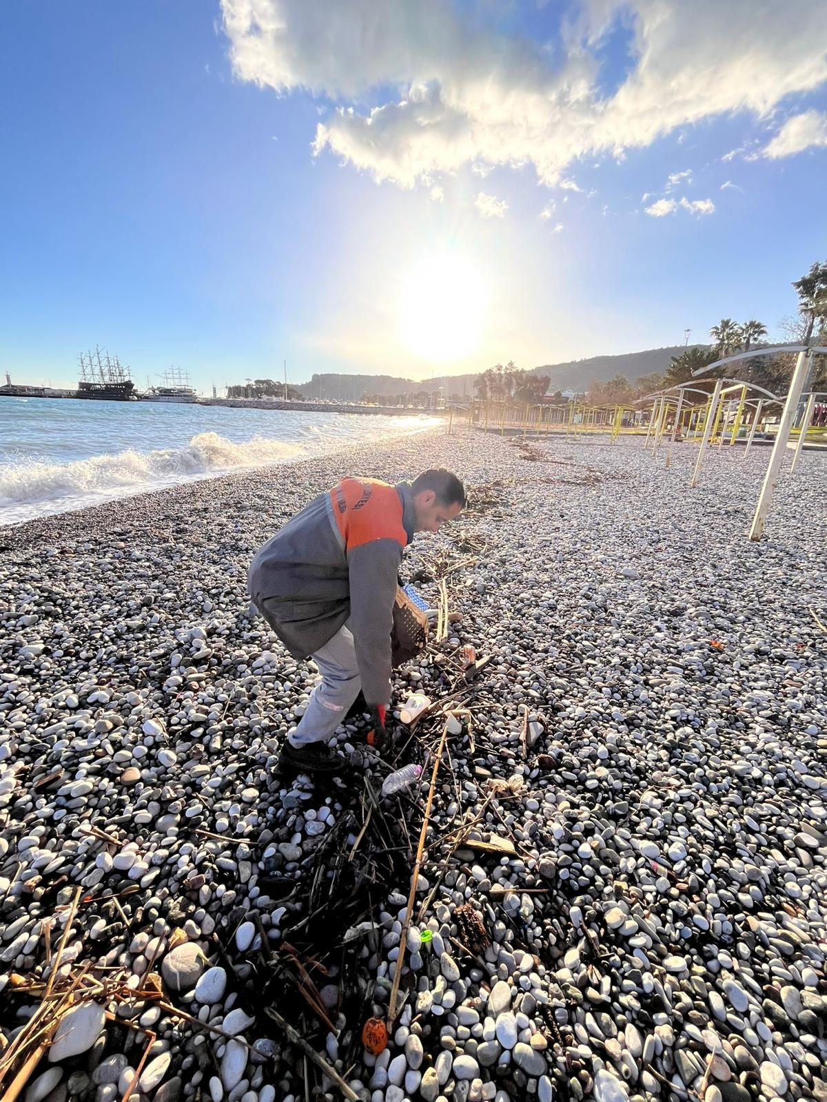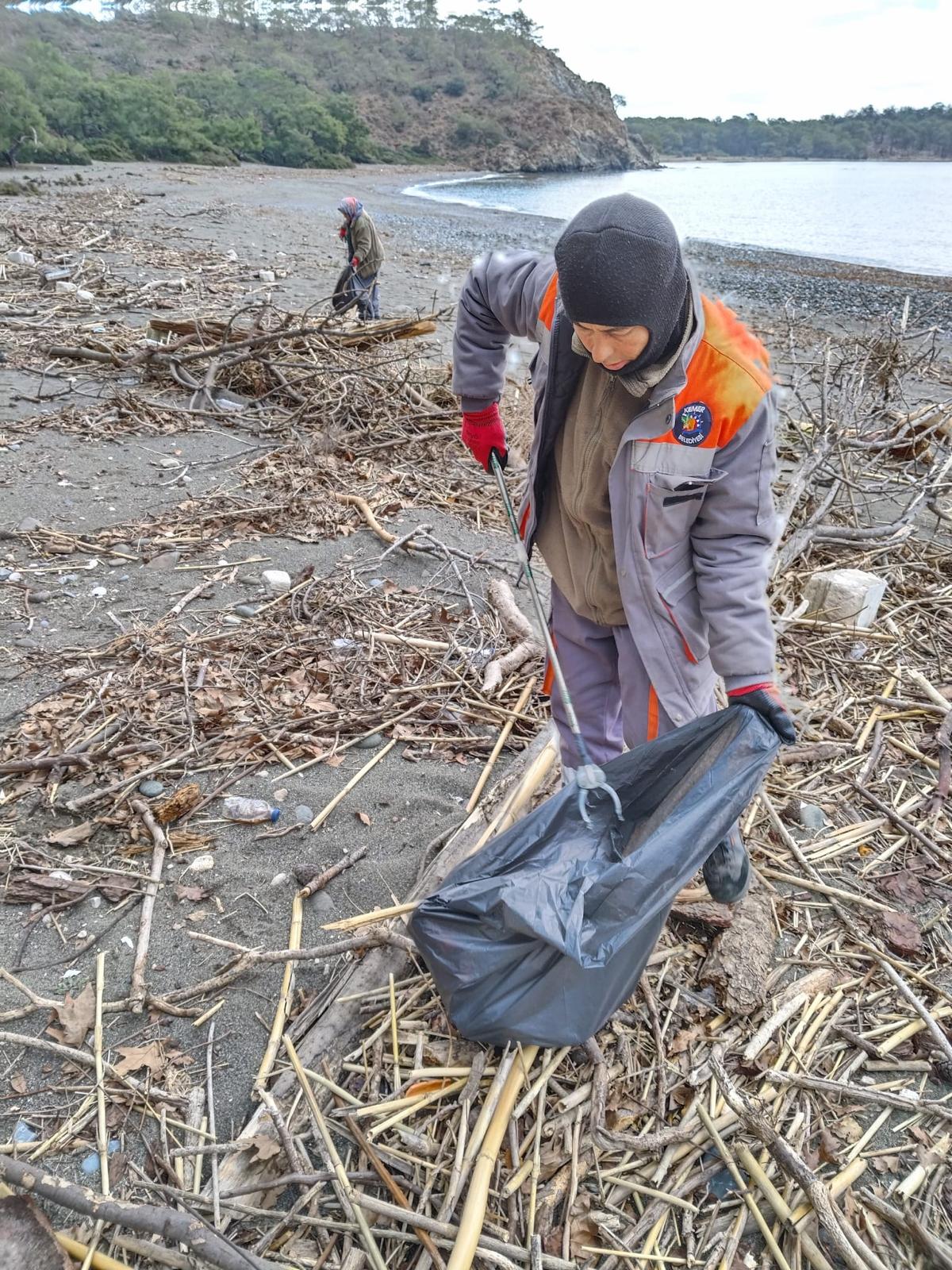 Kemer'de geçen haftalarda yaşanan şiddetli yağış nedeniyle kıyıya vuran plastik, alüminyum ve diğer çevreye zararlı atıkları temizleyen belediye ekipleri, onlarca torba çöp topladı.