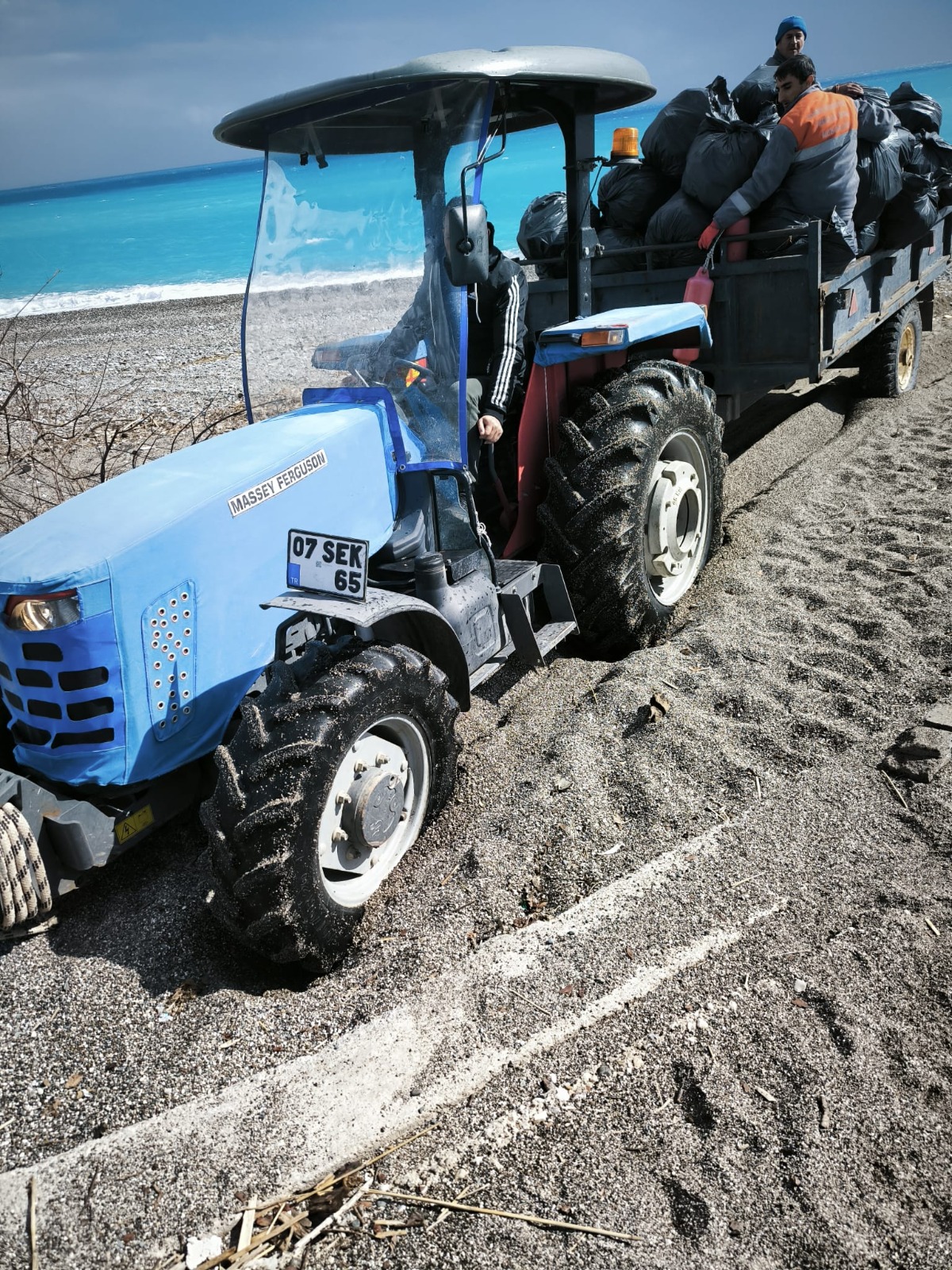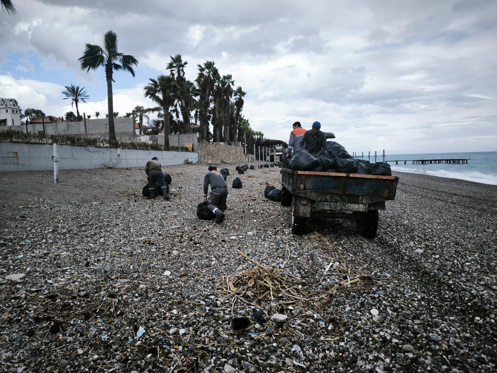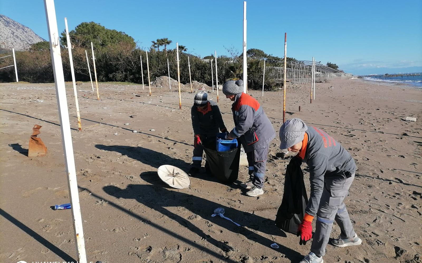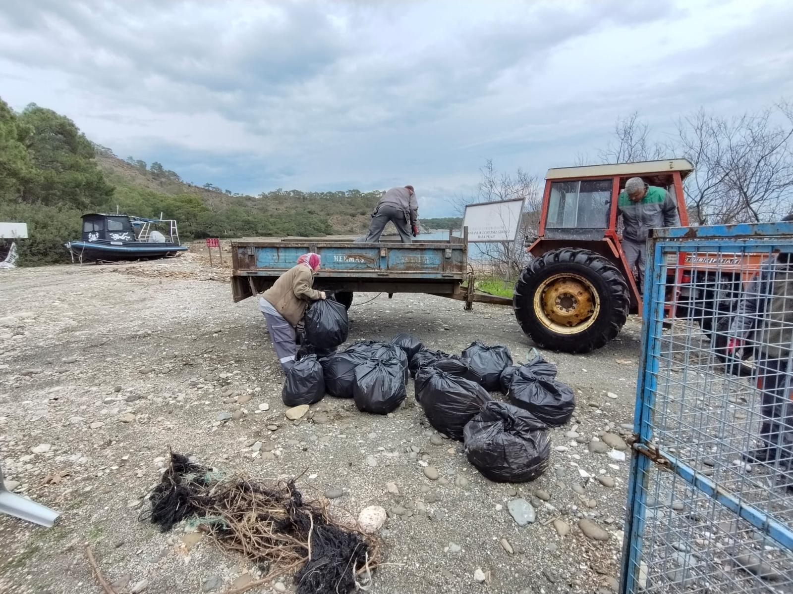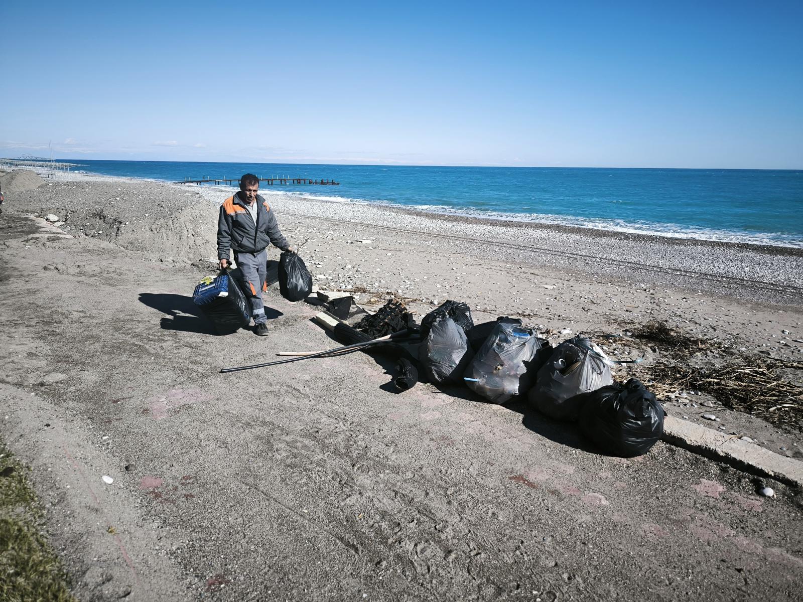 Kemer'de geçen haftalarda yaşanan şiddetli yağış nedeniyle kıyıya vuran plastik, alüminyum ve diğer çevreye zararlı atıkları temizleyen belediye ekipleri, onlarca torba çöp topladı.