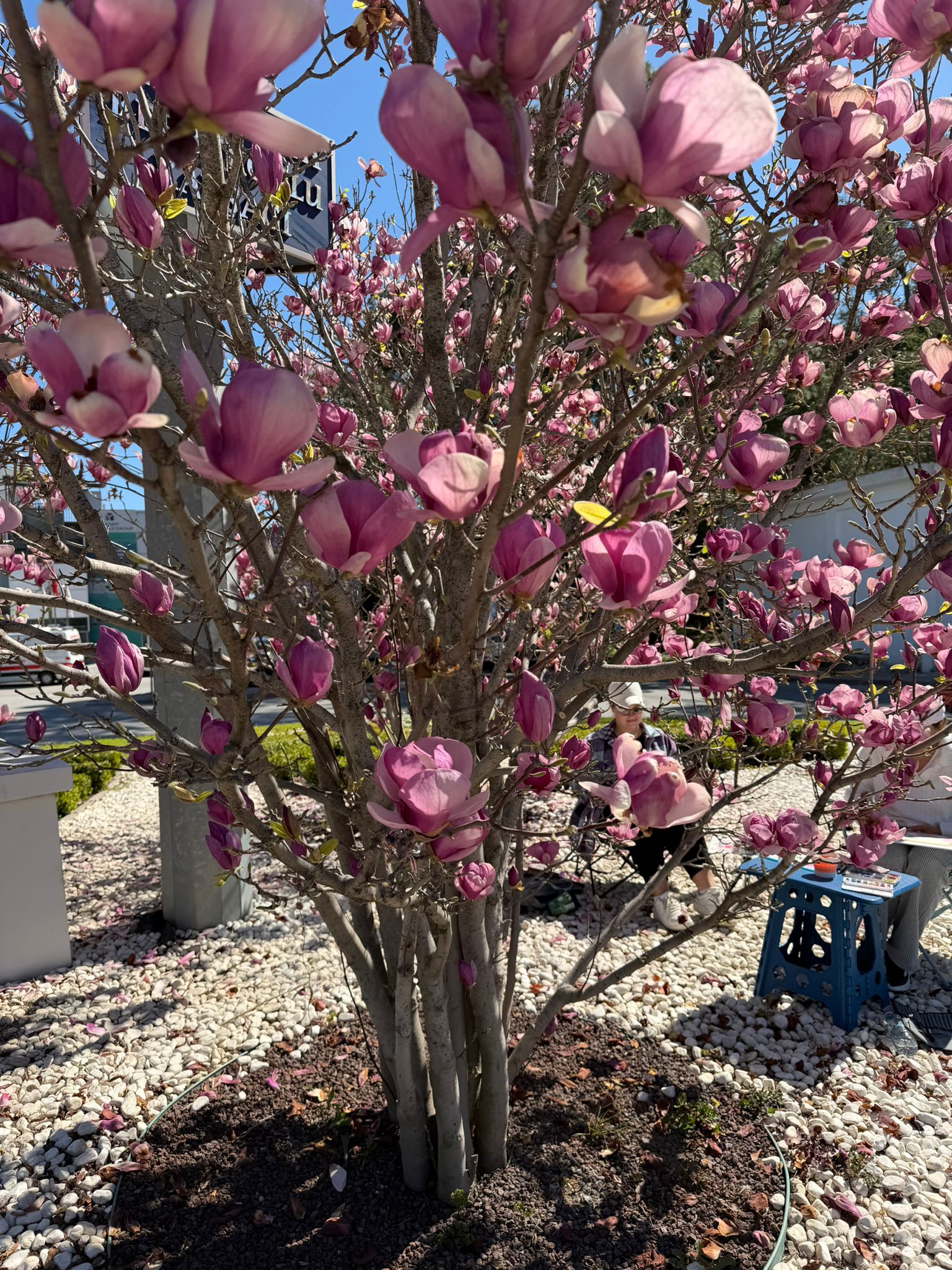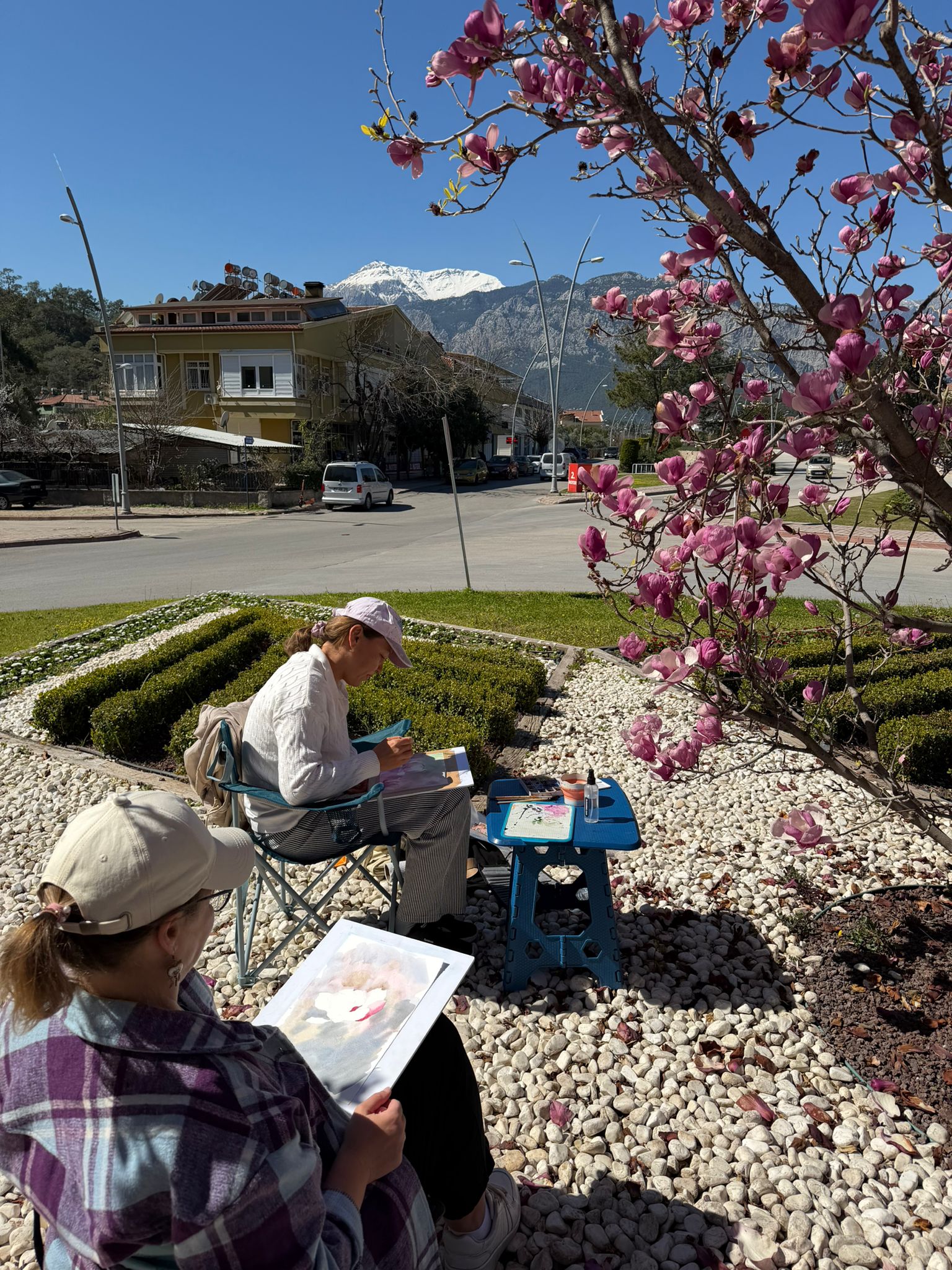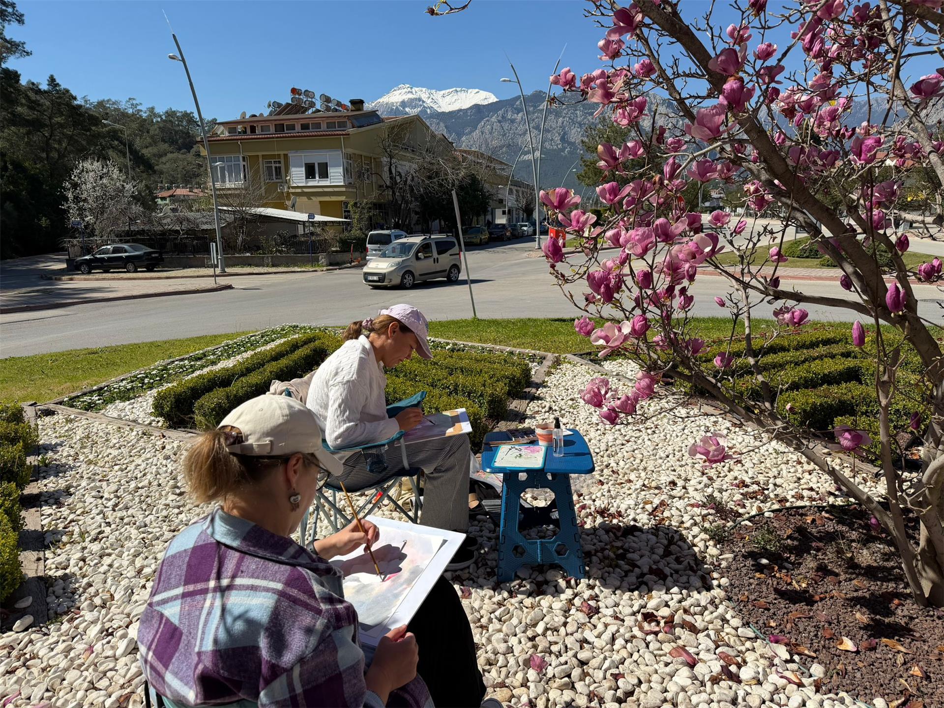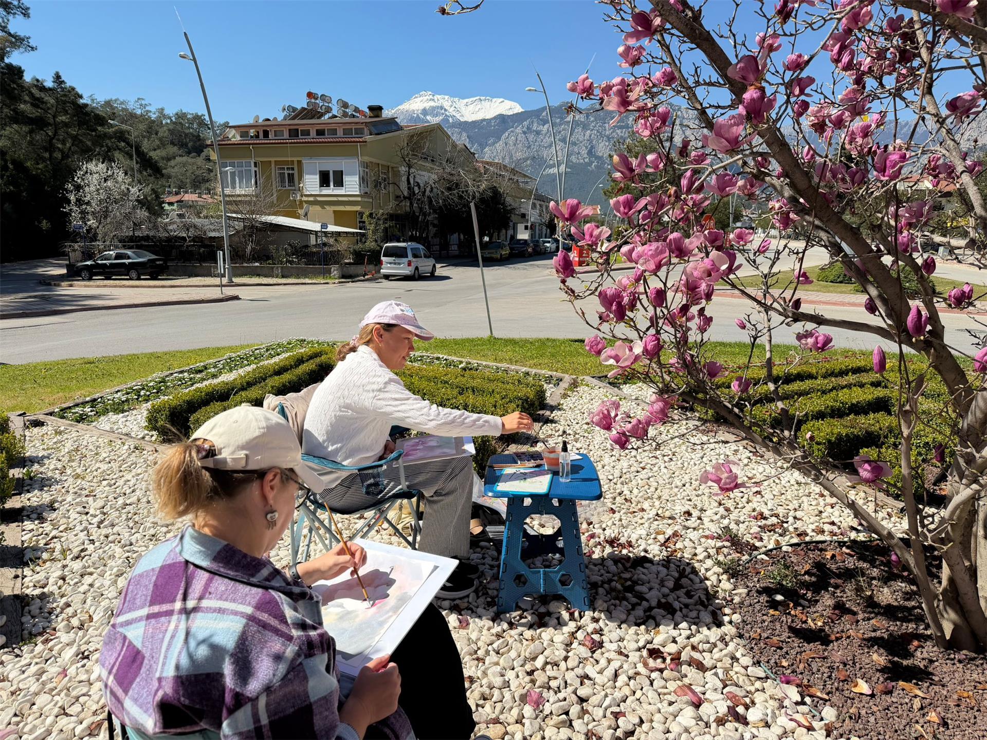 Hobi olarak guaj boya ve sulu boya ile resim yapan bazı turistler pembe çiçekleri bulunan manolyaları resmederken bazıları da manolyaların önünde bol bol fotoğraf çekmeyi tercih etti.
