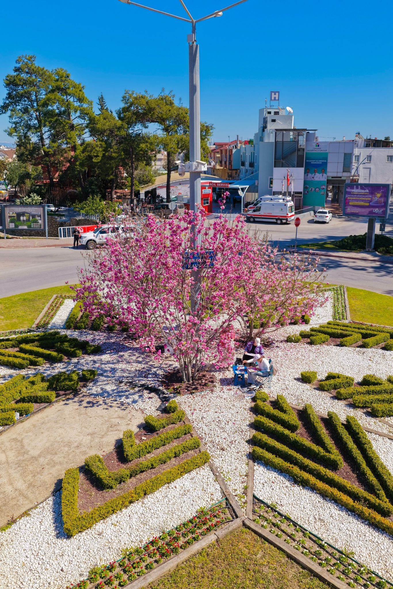 Türkiye'nin en önemli turizm destinasyonları arasında yer alan Kemer'de turistler, Kemer Belediyesi Park ve Bahçeler Müdürlüğü ekipleri tarafından dikilen ve nadir bulunan yaprak döken cinsten manolyayı tablolarına yansıtıyor.