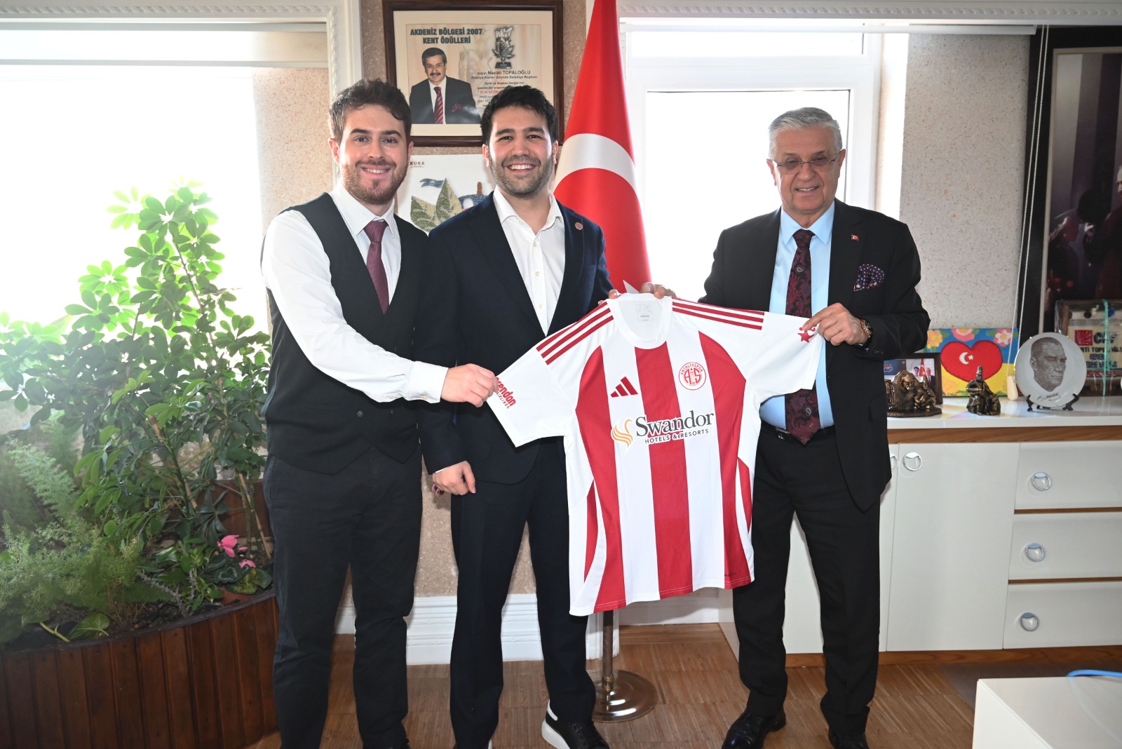 Ziyaret sonrası Başkan Topaloğlu öğrencilerle hatıra fotoğrafı çektirirken, Muratpaşa Belediye Meclis Üyesi ve sanatçı Durmaz da Başkan Topaloğlu'na Necati Topaloğlu yazan bir forma hediye etti.