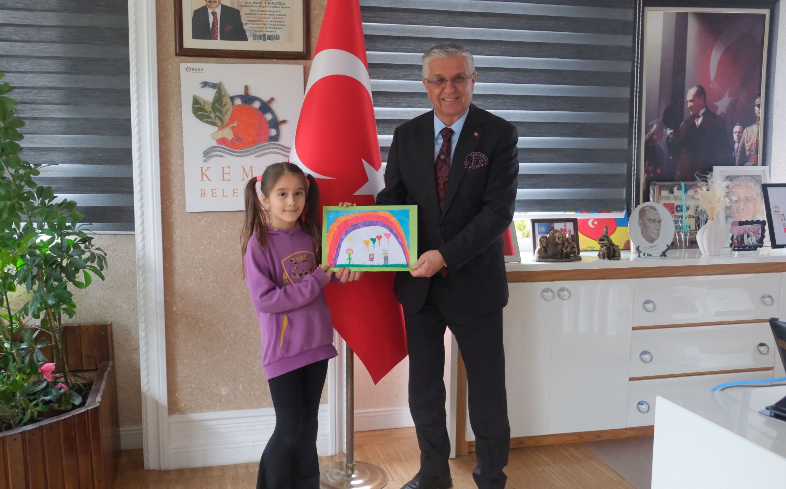 Öğrenciler ise Başkan Topaloğlu'na yaptıkları resim ve yazdıkları şiirleri hediye etti.