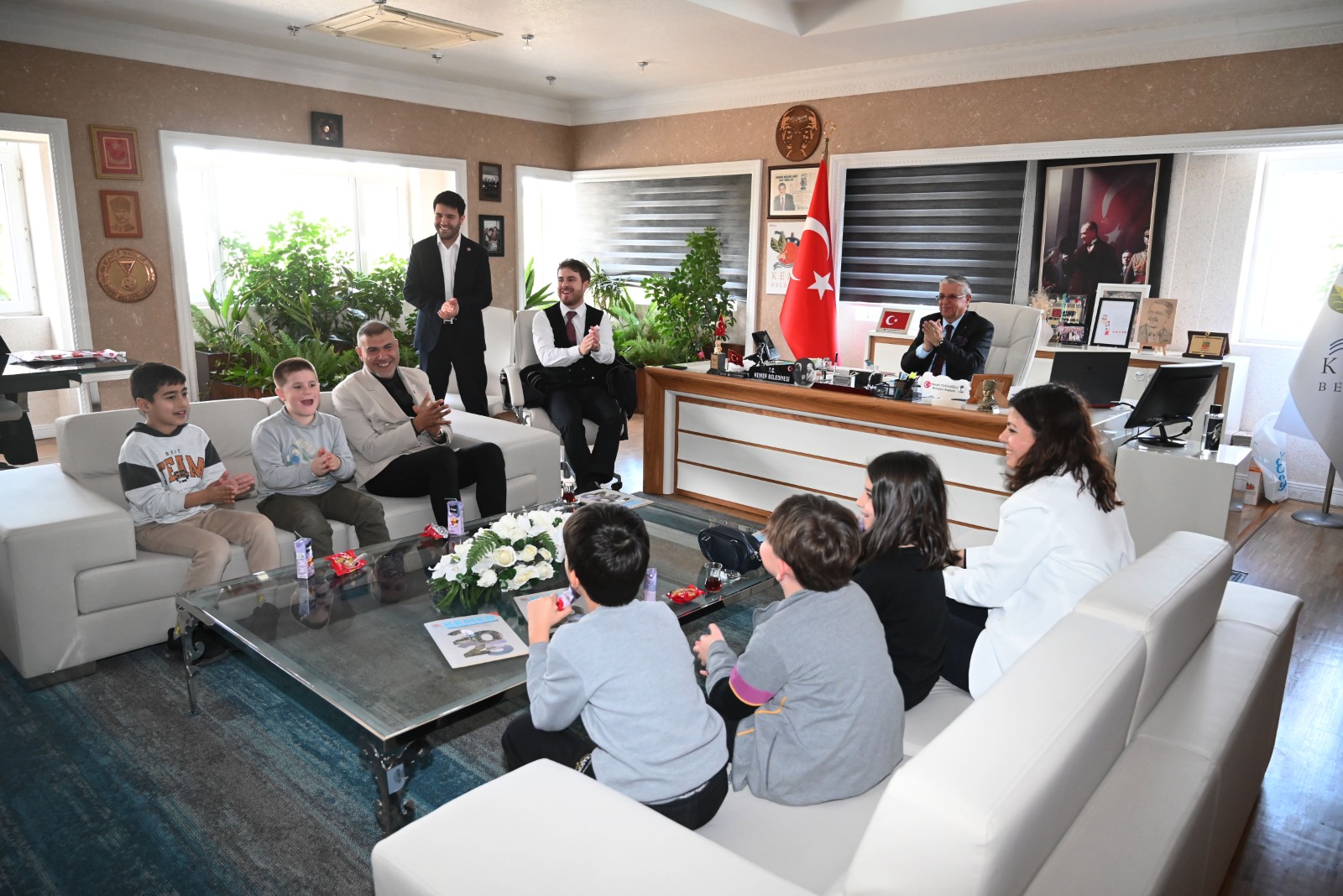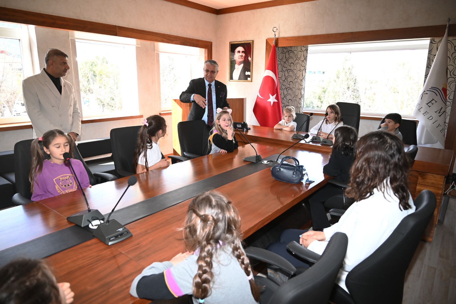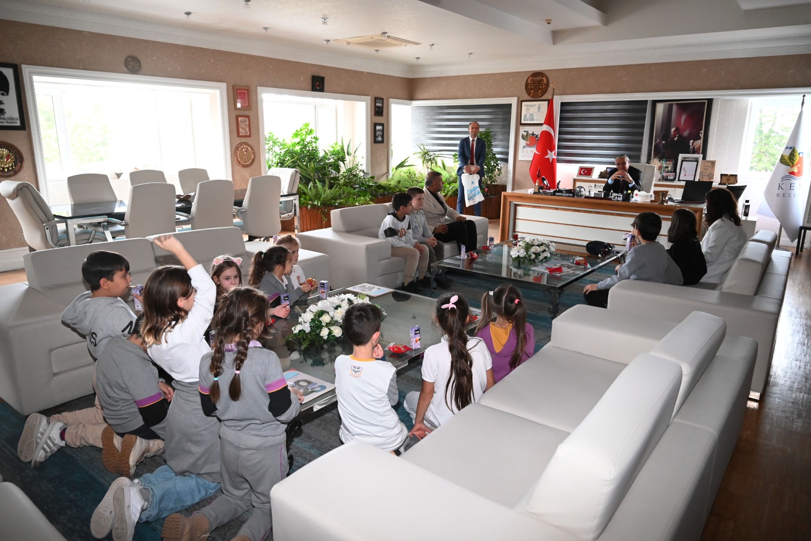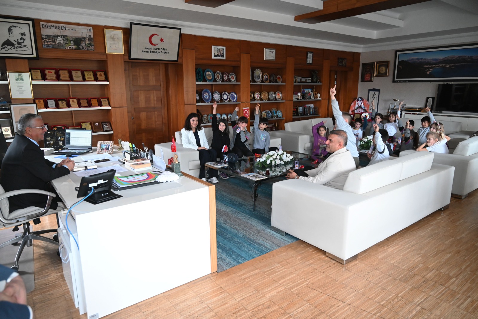 Özel Uğur Okulları Kemer Şubesi 2/A sınıfı öğrencileri, okul müdürü İdris Bayram ve Sınıf öğretmeni Semra Akçağlayan eşliğinde Kemer Belediye Başkanı Necati Topaloğlu'nu ziyaret ederek merak ettikleri soruları sordu.